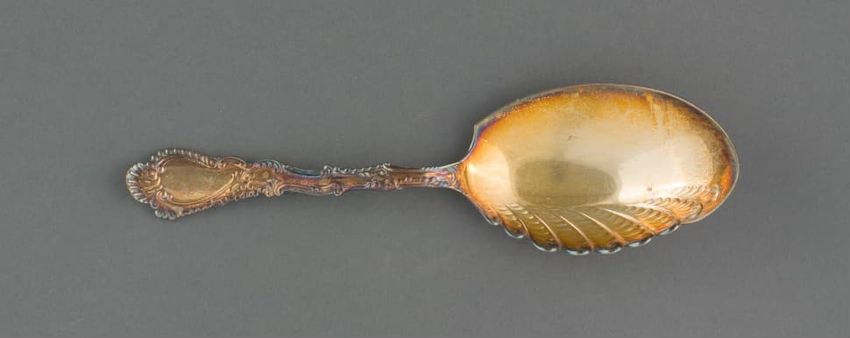 Silver souvenir spoon that depicts Columbus and Machinery Hall.