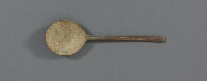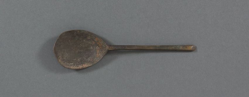 Metal mustard spoon. Fiddle handle with square shoulders and an oval bowl.