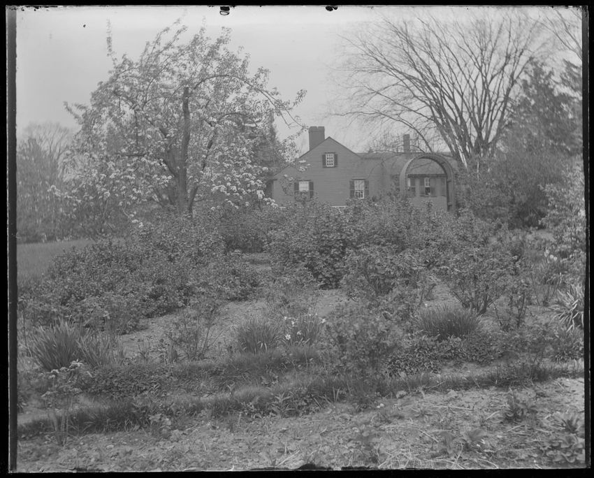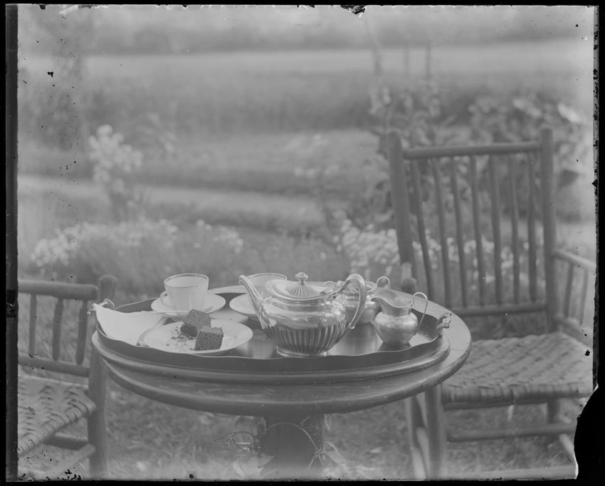 The image shows a tea set arranged on a small round table in the garden of the John Crehore House in Milton, Massachusetts. The teaset includes a teapot, a sugar bowl, a cup, plates, and two slices of cake. The table is flanked by two wooden chairs, and the garden in the background features a variet...