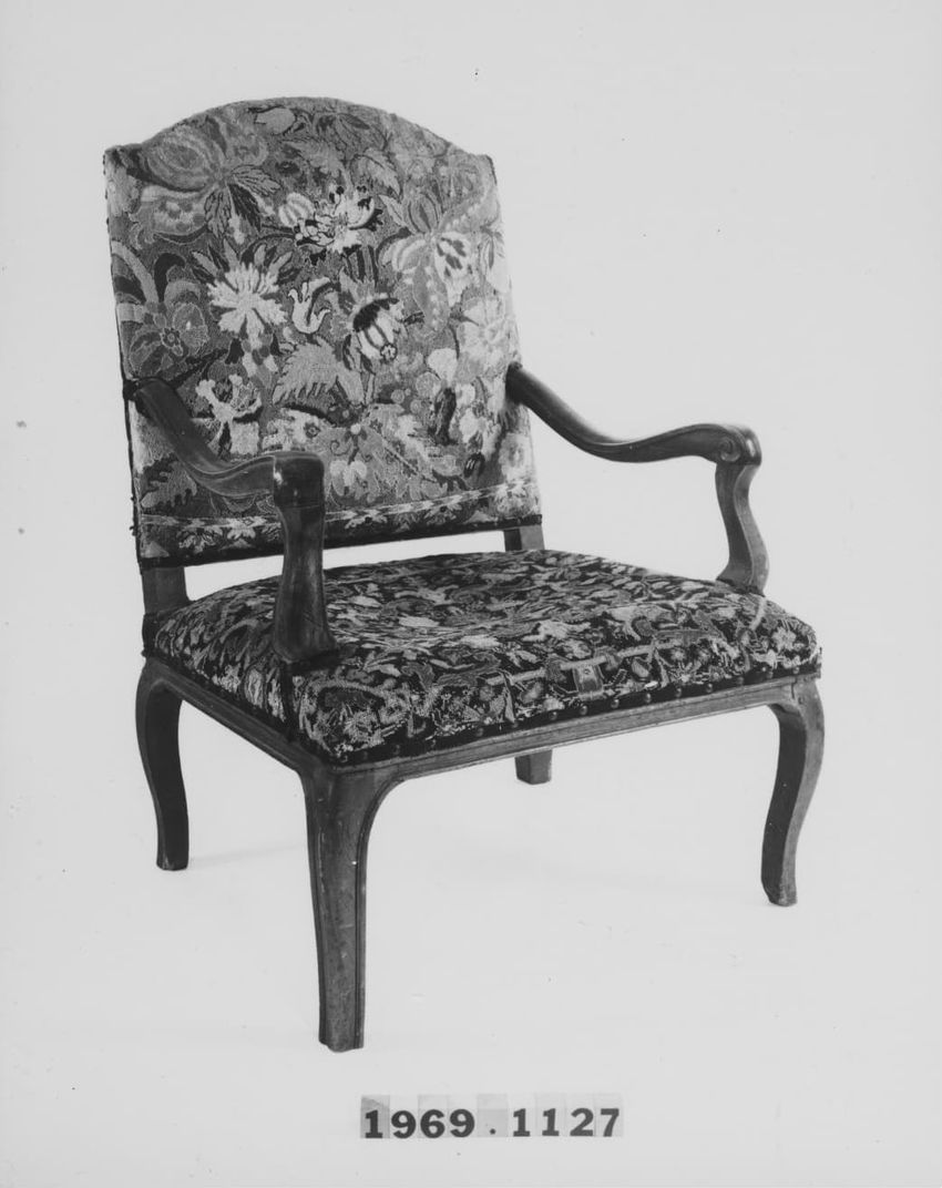 Small, ash splint gathering basket with carved handle. Square bottom, vertical sides, and round rim. Ash splint wicker weave with a checker weave base. The inner rim is carved wood with an outer, splint rim held in place with a single ash splint lash.