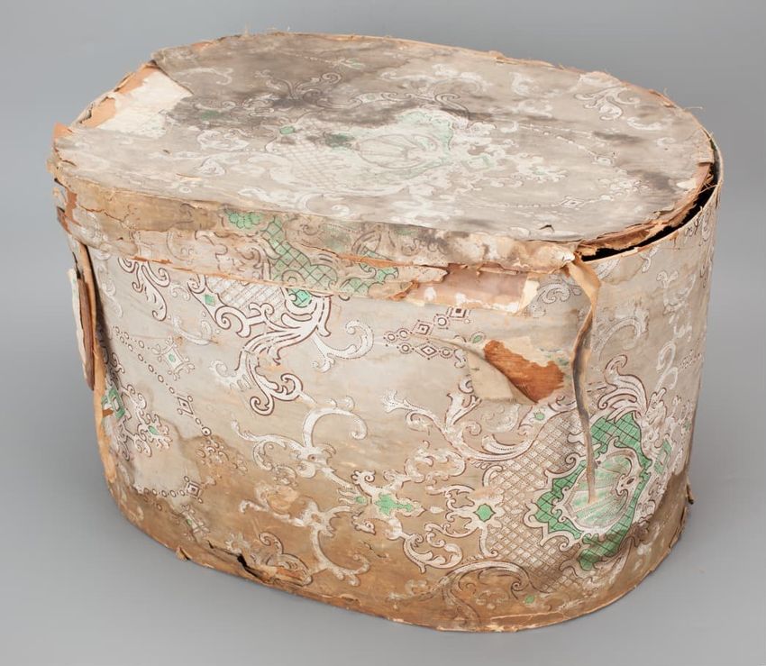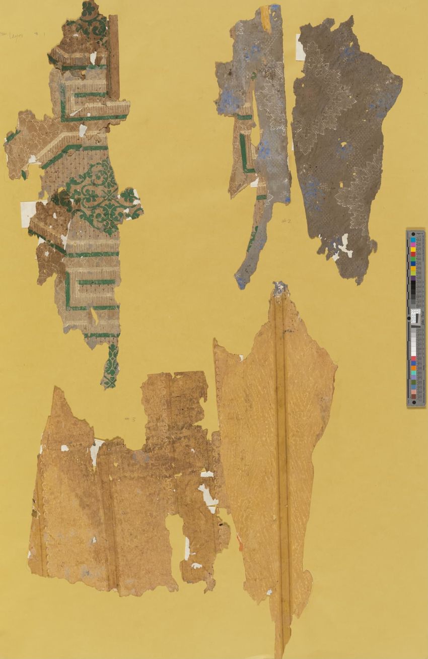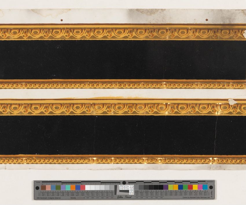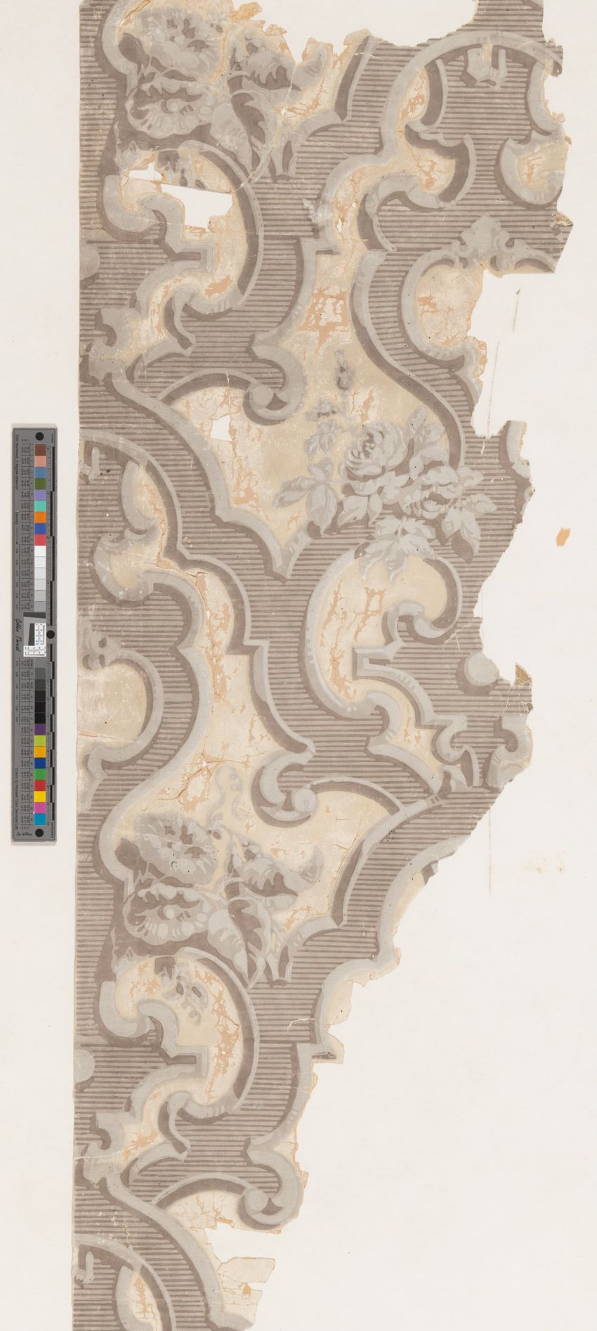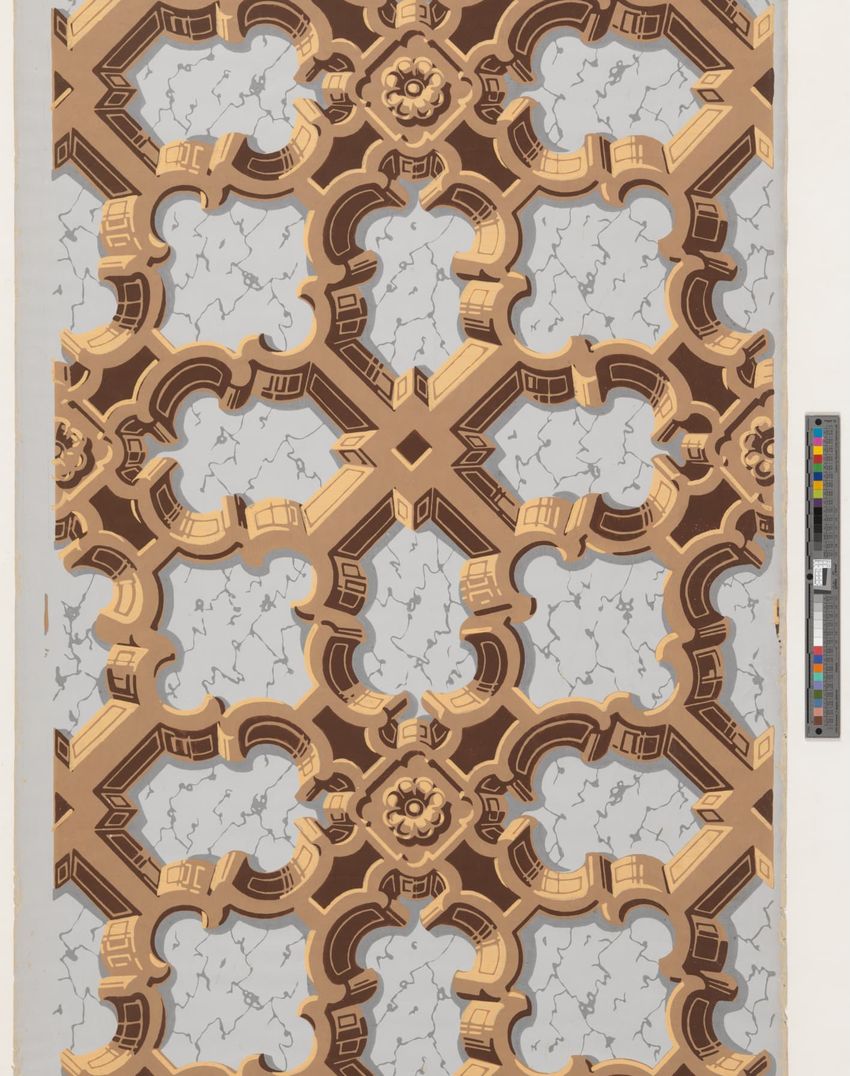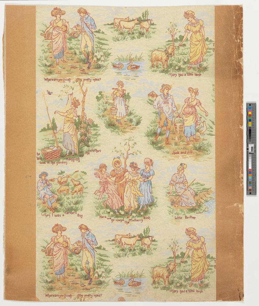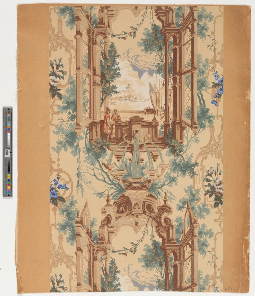 Unused sample. Landscape figure paper. Repeating vignette of maid and gentleman meeting over water pump; surrounded by lush greenery and flowers. Prints in grey, two browns, mauve, three greens, red, pink, yellow, cream on grey ground.