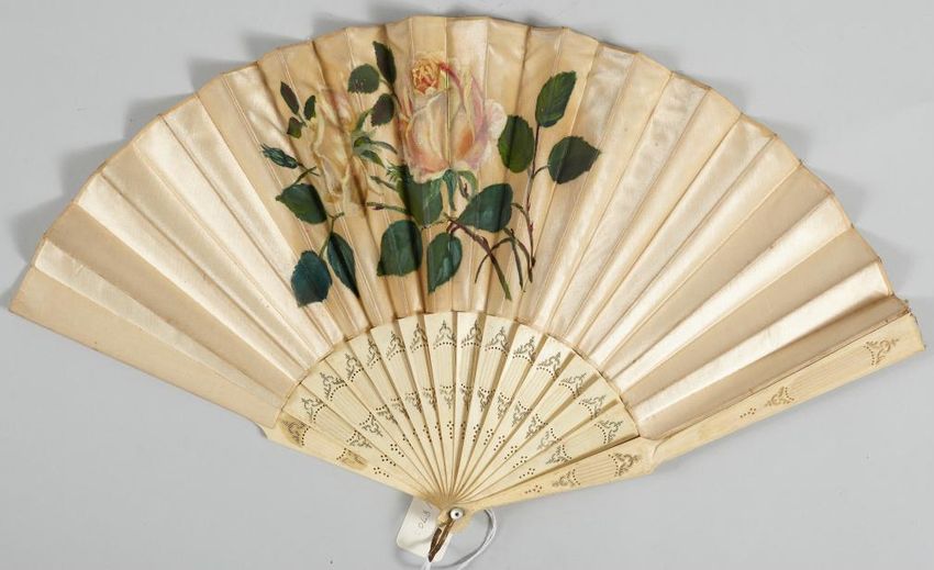 Folding fan; carved and combed ivory sticks and guards; leaf of white satin painted with two pale roses in oil; white satin leaf back; arched metal loop; mother of pearl rivets.