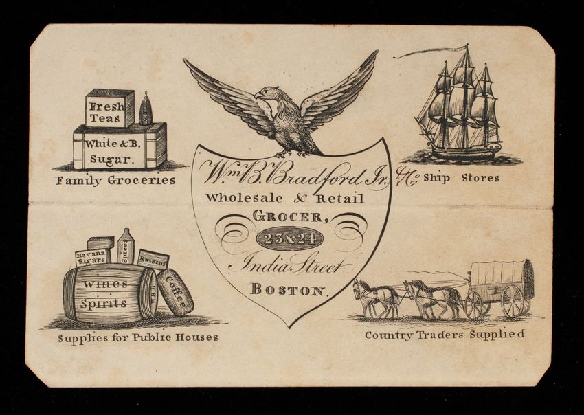 Trade card, Wm. B. Bradford, Jr., wholesale & retail grocer, 23 & 24 India Street, Boston, Mass.