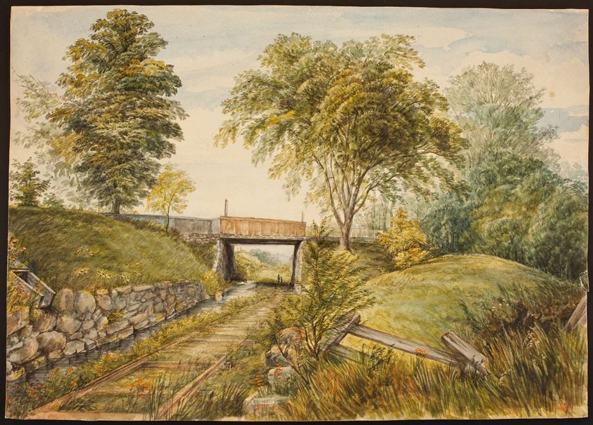 Main Street bridge on way to Browne House, looking North. Trees along railroad tracks going under bridge. Stone wall and wooden drainage structure in foreground.
