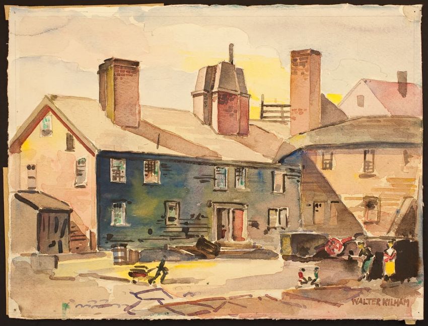 Typewritten text on the verso reads "House built about 1660 and destroyed ? Painted July 1934 by Walter H. Kilham after a sketch made by him 31 May 1889."