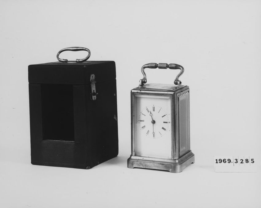 Black rectangular carriage clock with four gallon panels, molded frame, bail handle, white face with roman numerals