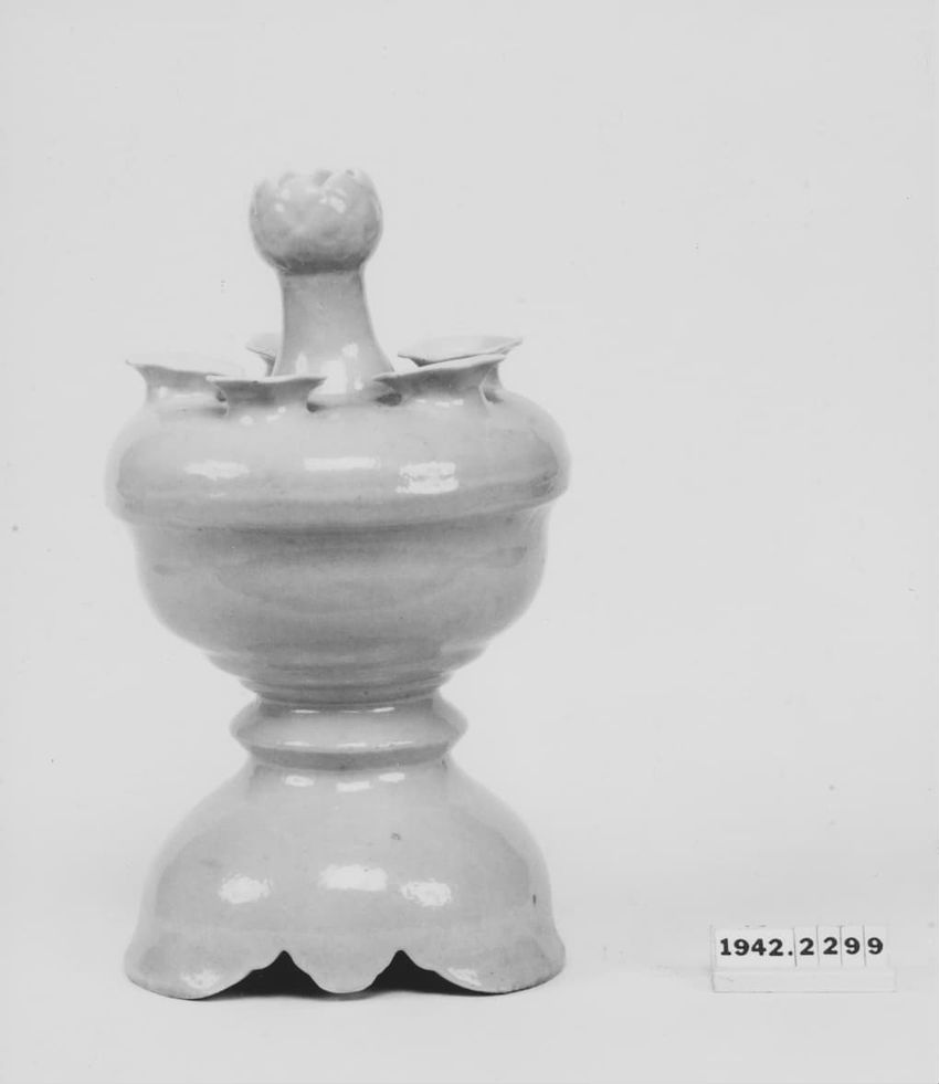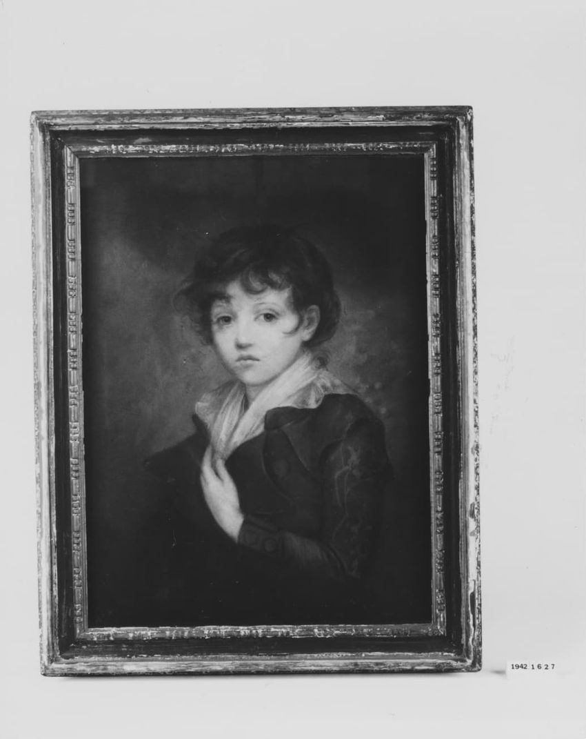 Brass watering can with an oval body, flat bottom, quarter-hinged lid, spout, and handles at the side and top.