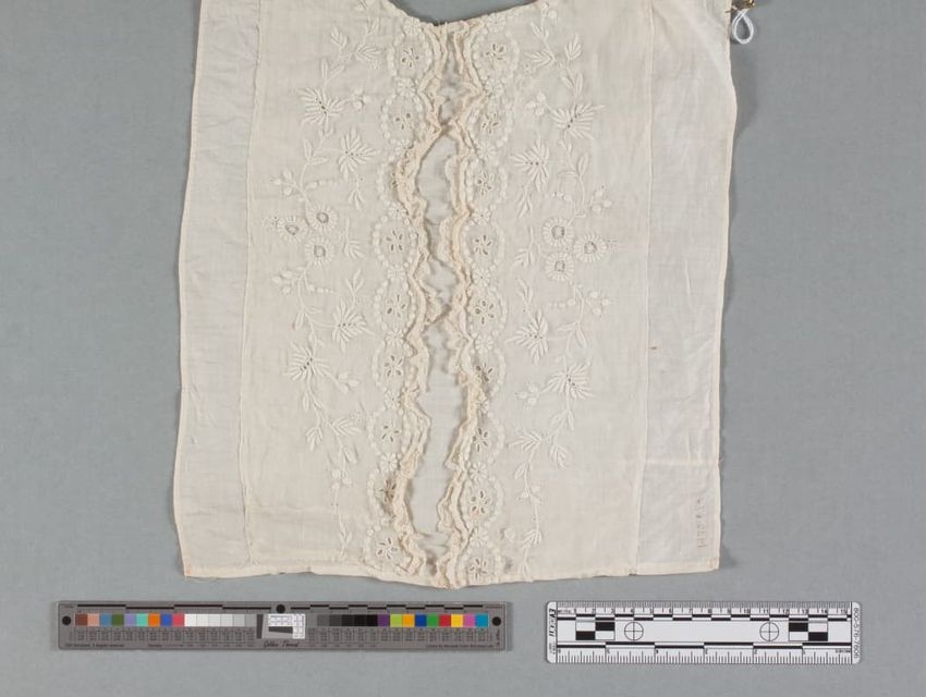 White china silk with net inserts; Bodice (A) - blouson bodice with standing band collar (boned) and yoke of lace with foliate garland and stylized flowers; lace ruffle around yoke; stitched pleats around yoke front and back; band of lace inserted below pleats, and near shoulders on sleeves; elbow l...
