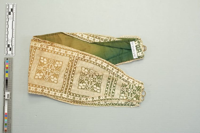 Sheer white panel with trim of lace over green fabric, fluting on two sides.