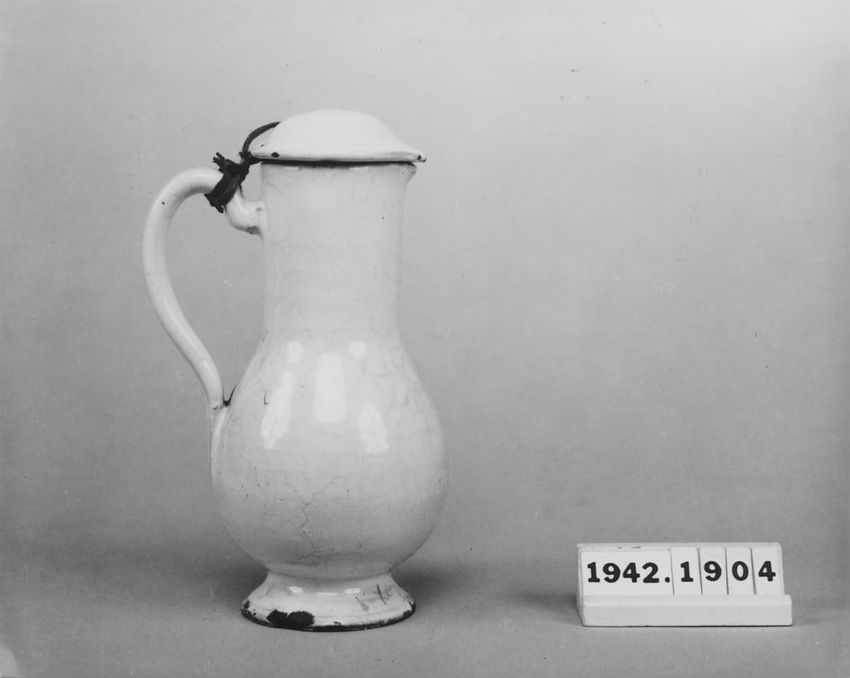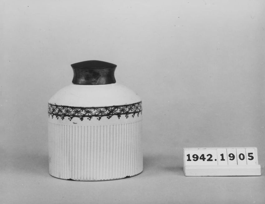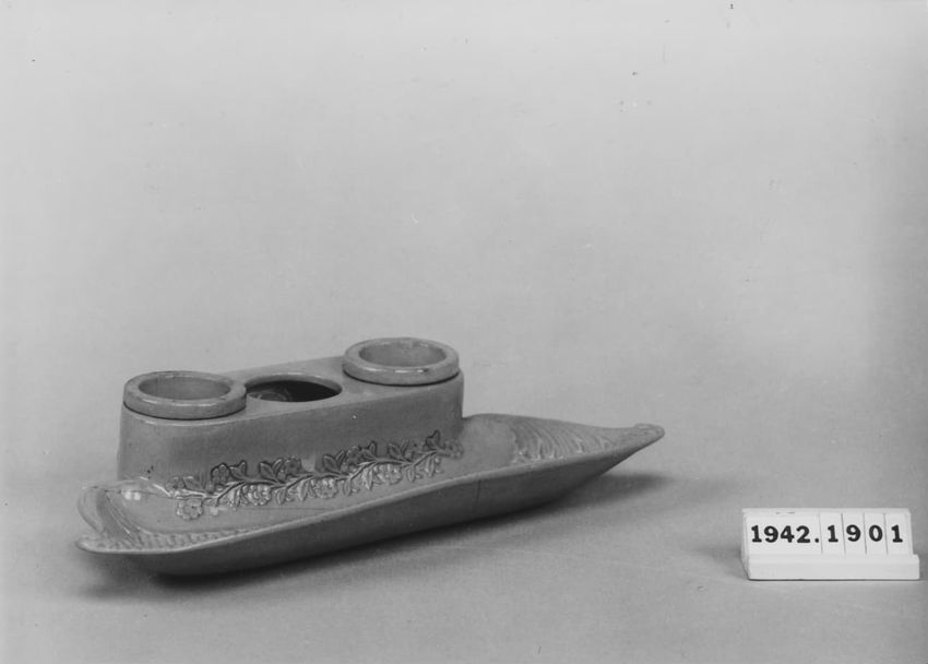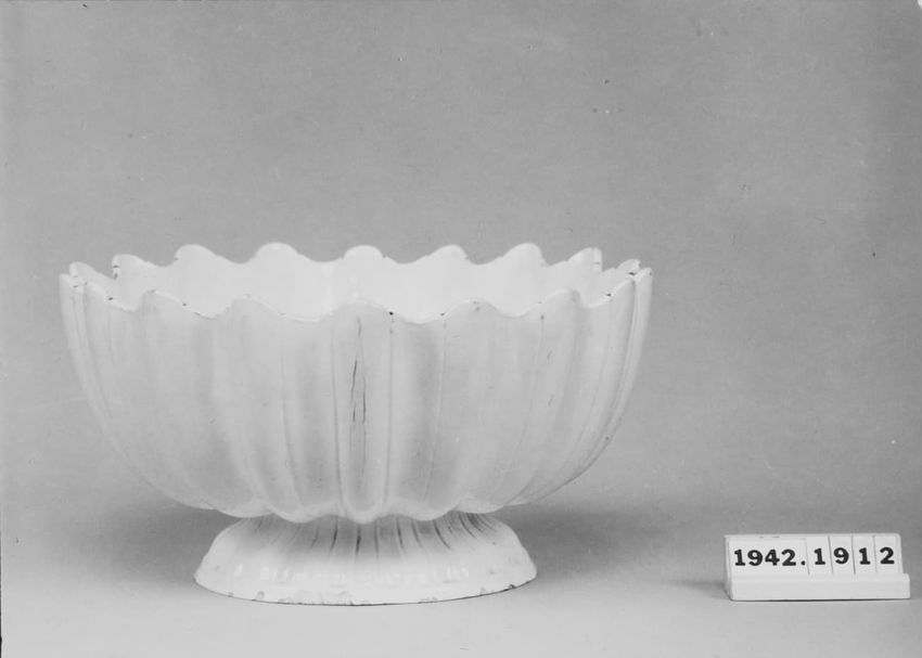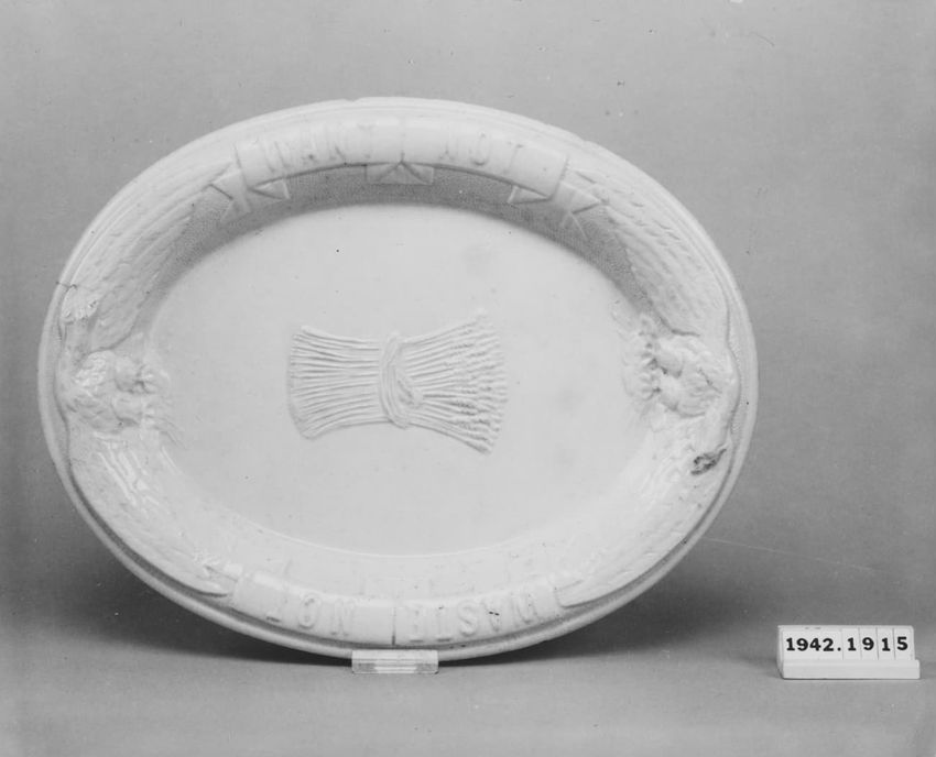 White, oval platter with a deep well, curved sides, and a molded eagle and wheat motif. With the words "Waste Not, Want Not" on the rim.