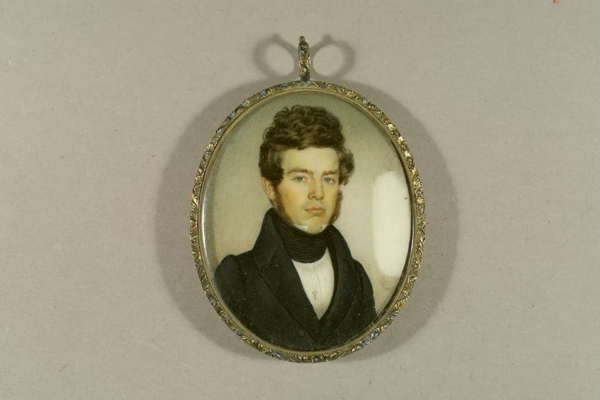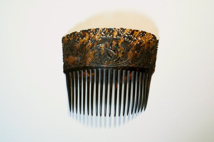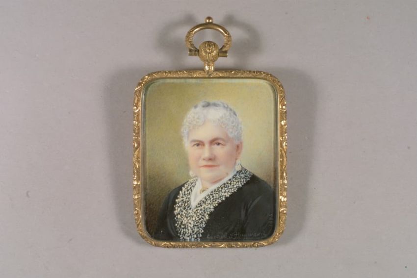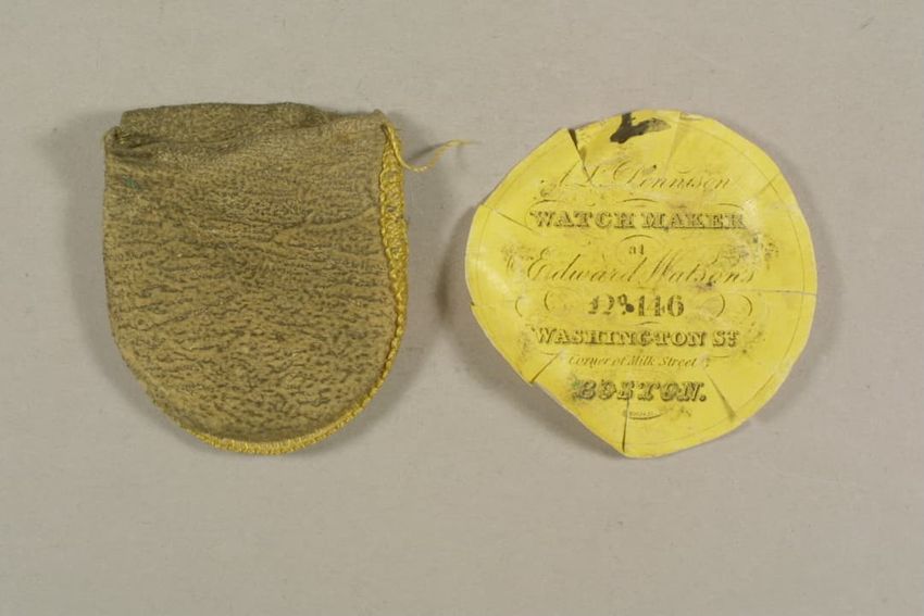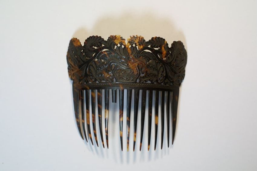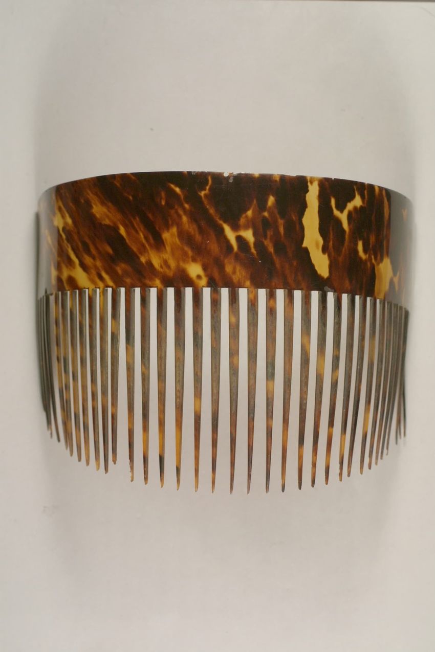 This headdress is composed of a single strand of silk leaves, white silk flowers, and wax-coated silk orange blossoms. It has a pair of matching drop orange blossom earrings with french wires (.2ab) and a corsage of orange blossoms and leaves set against a tulle net pouf (.3). The entire group was o...
