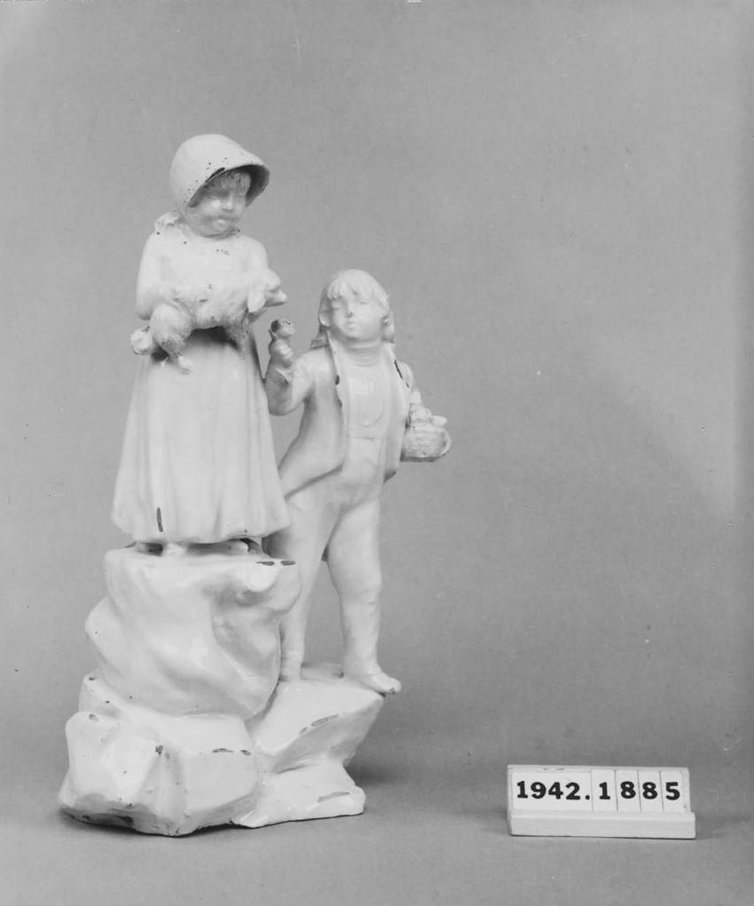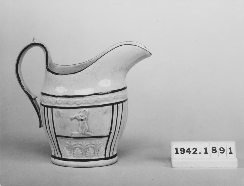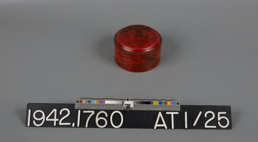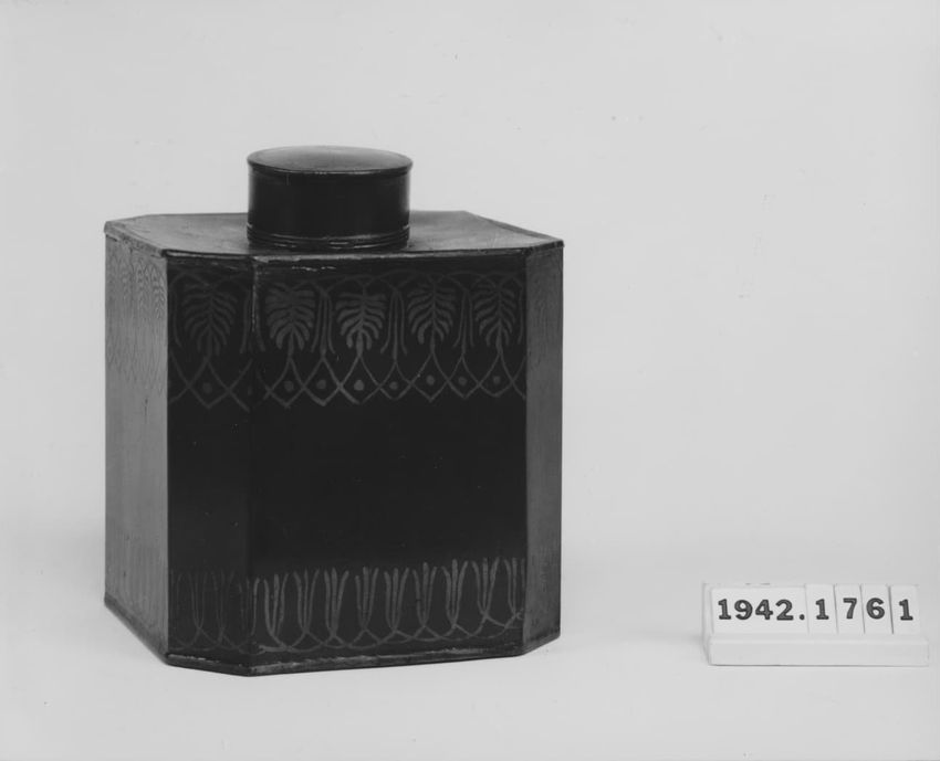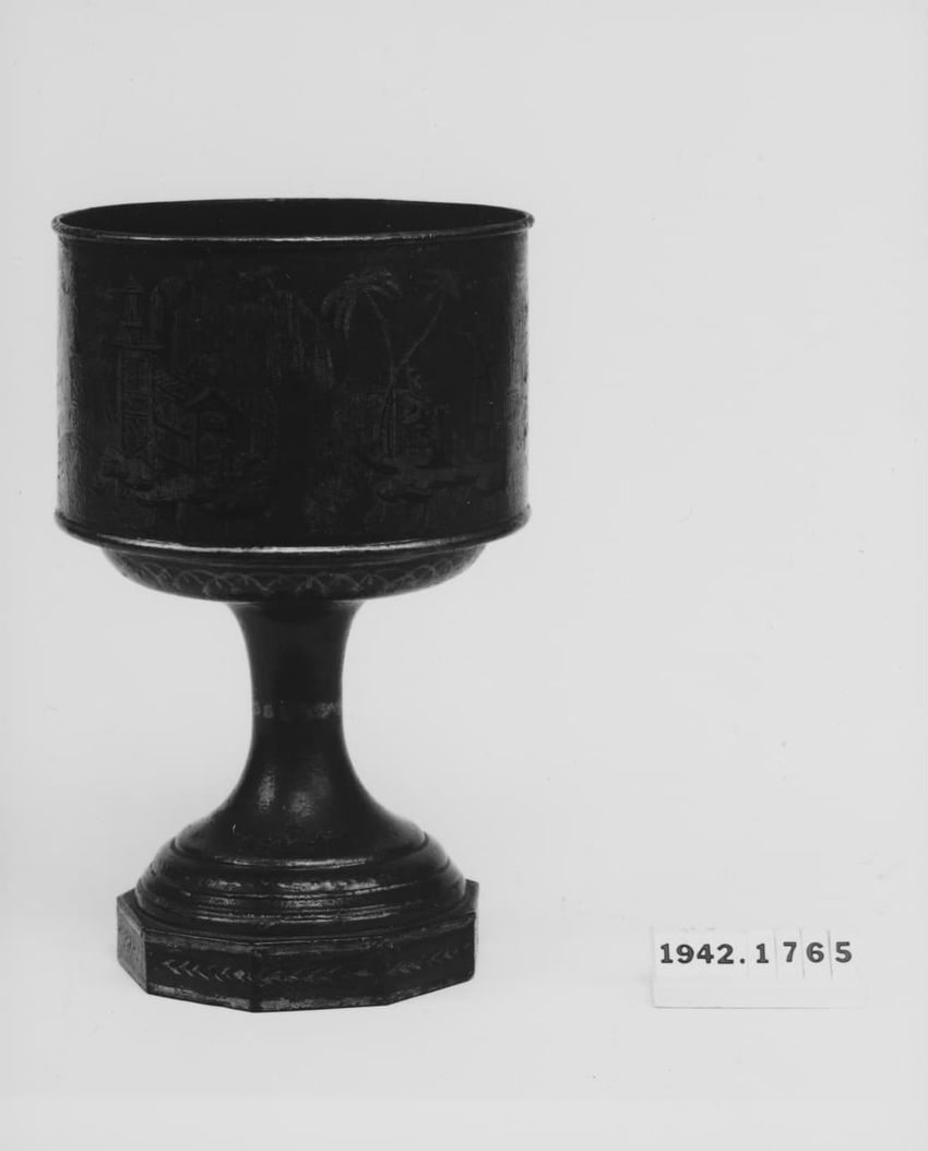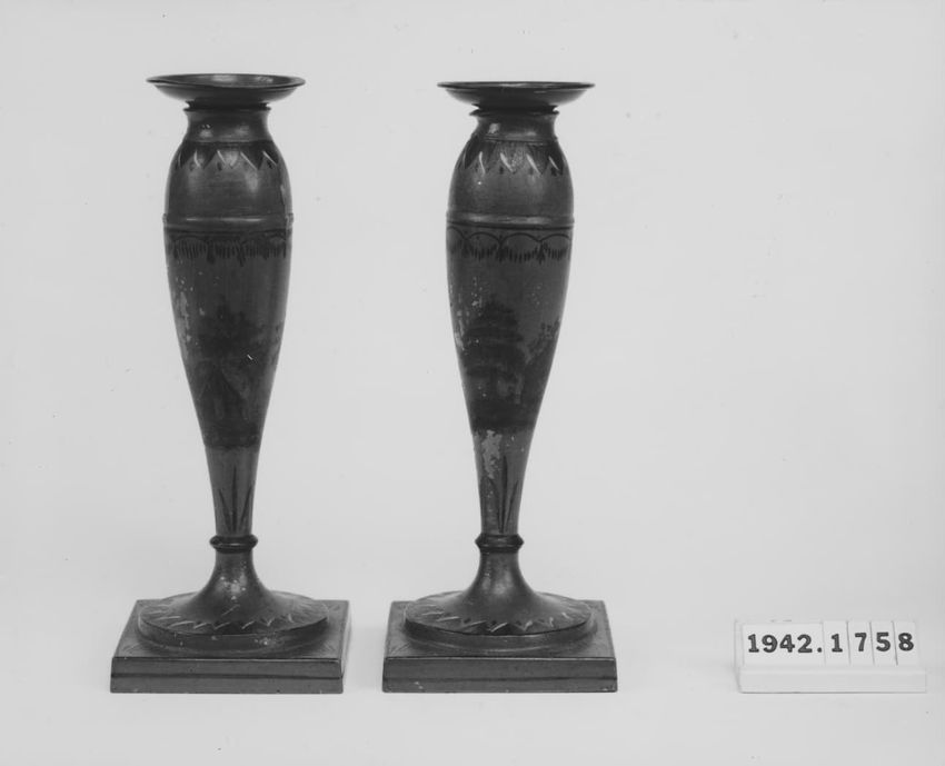 Candlestick with a tapered bulbous body, cicular bobeche, and square base. Red, black, and gold decoration with swag motif and a cottage scene. One of a pair.