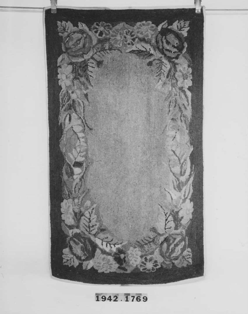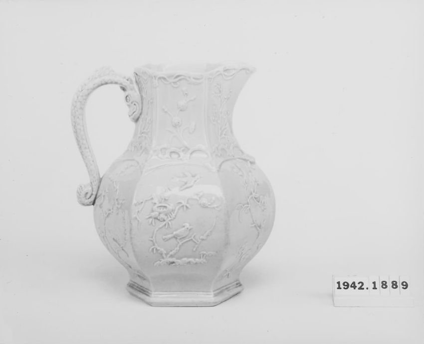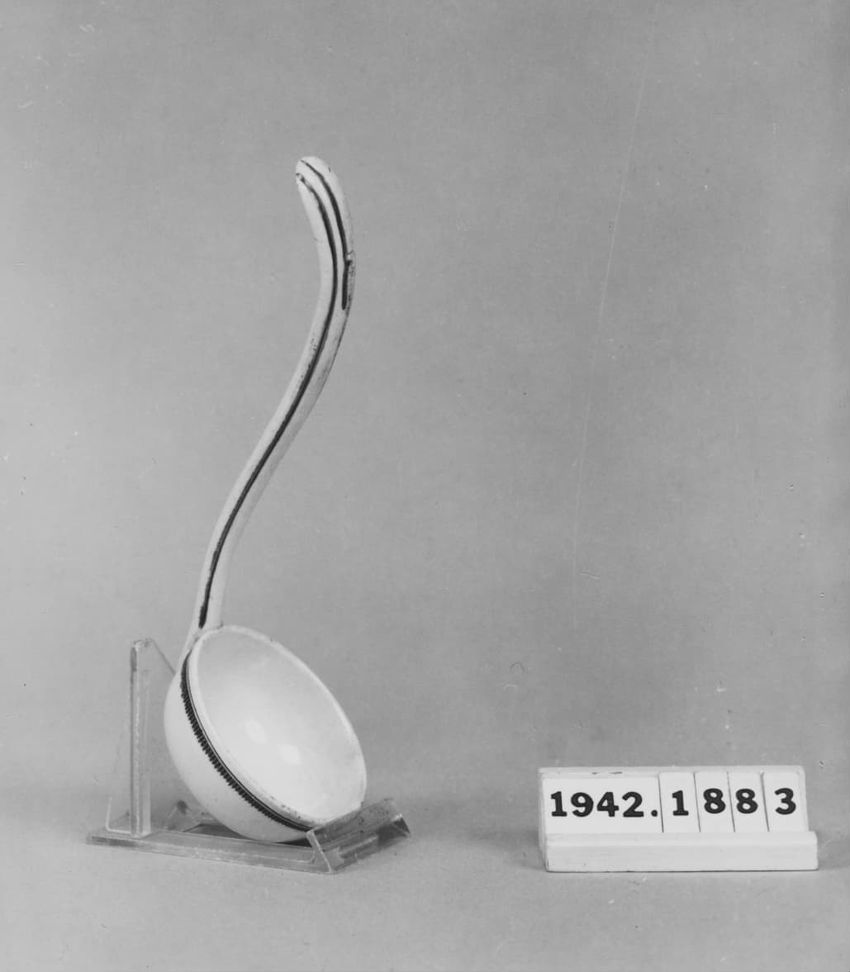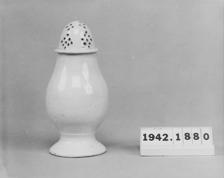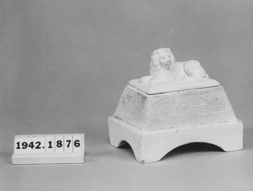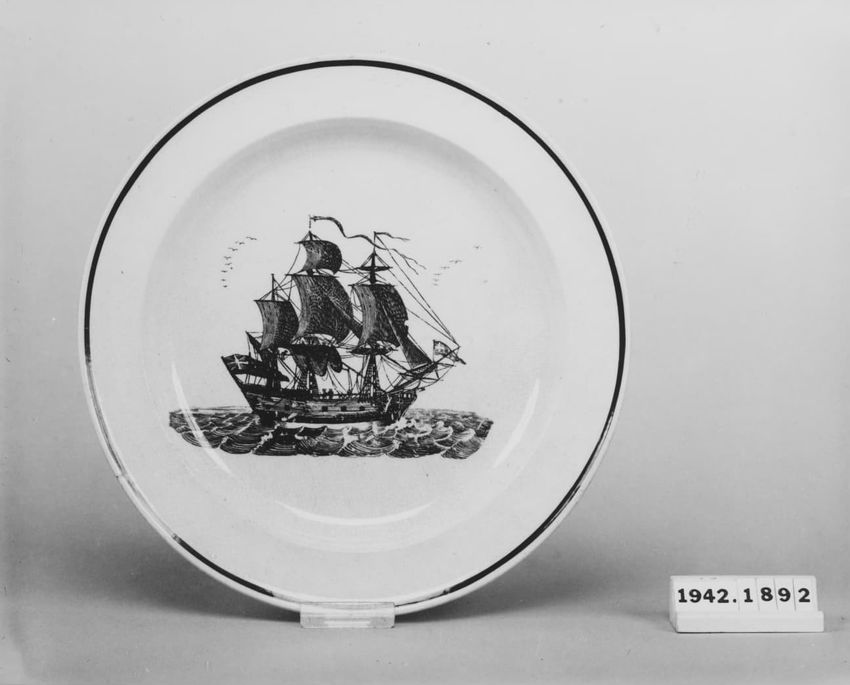 Candlestick with a tapered bulbous body, cicular bobeche, and square base. Red, black, and gold decoration with swag motif and a cottage scene. One of a pair.