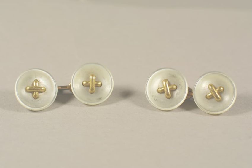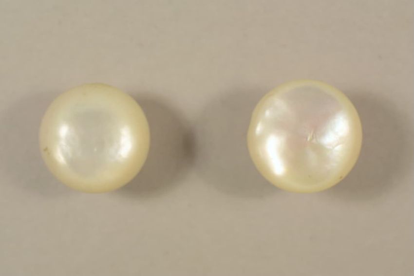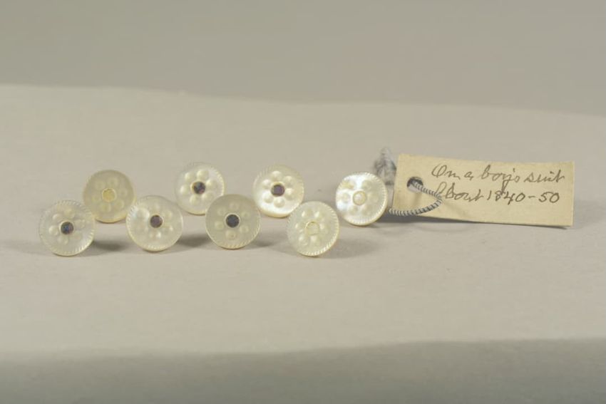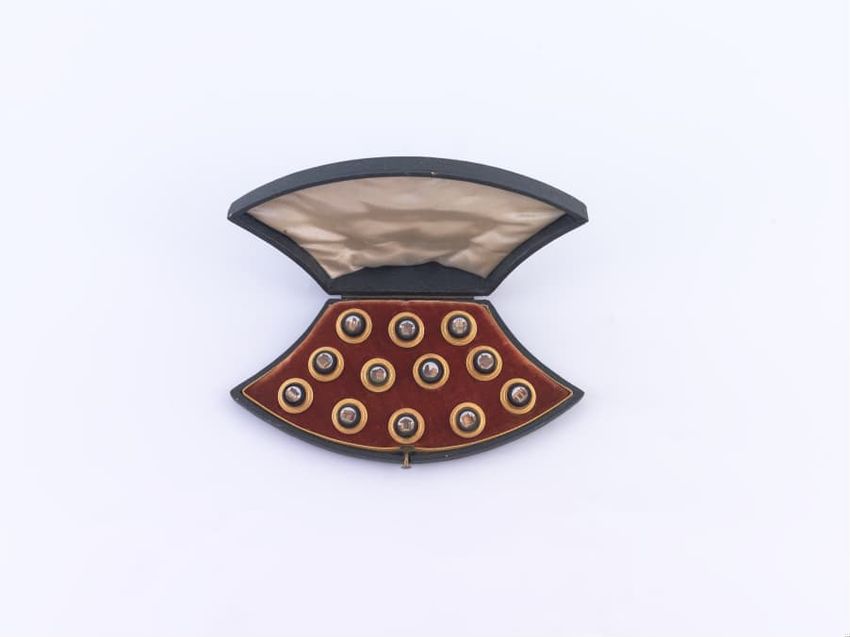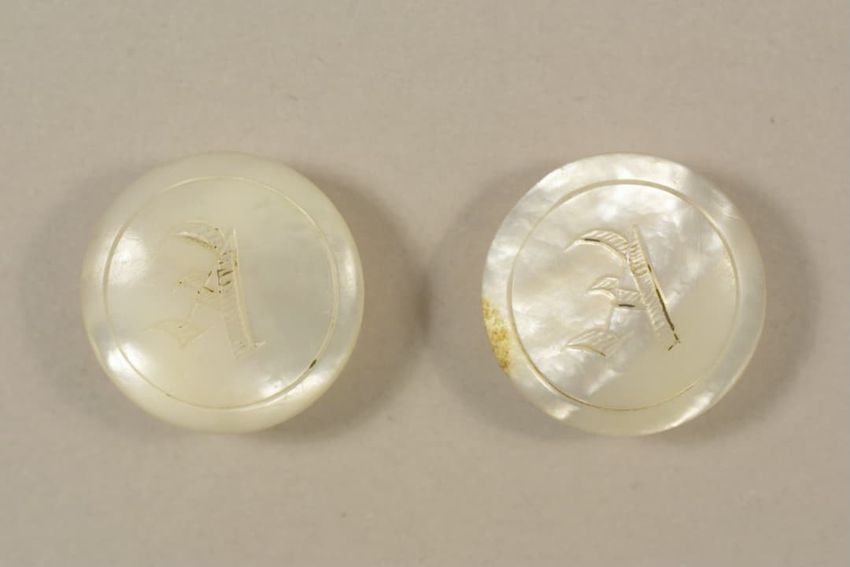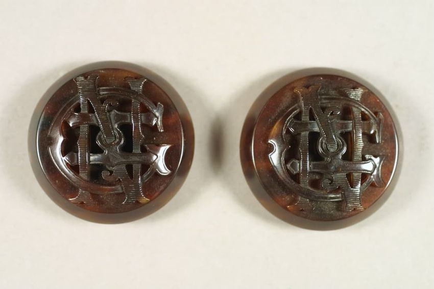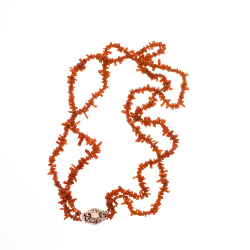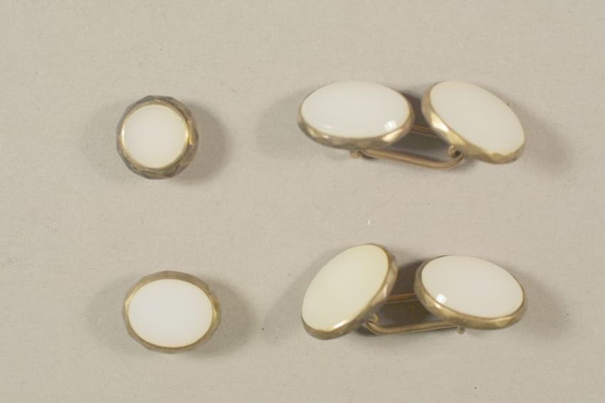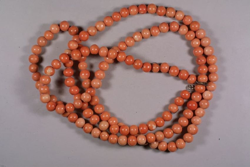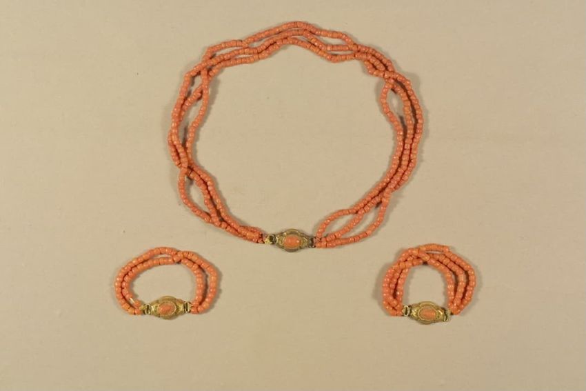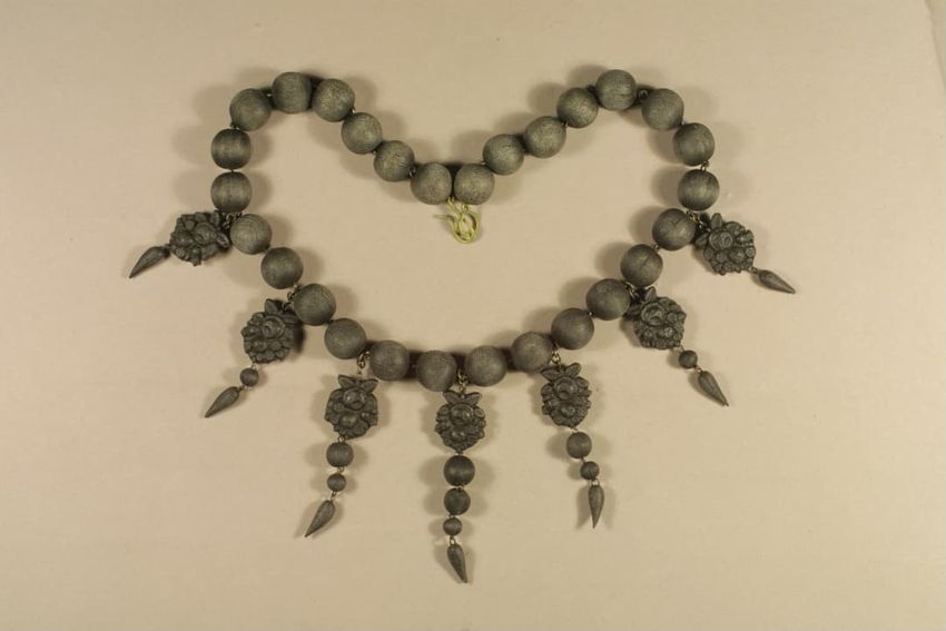 Two jet bead "dog collar" style necklaces, so named for their close fit around the neck. "A" worked with beaded square panels alternating with swags of beaded strands, collar fastened with four metal snaps."B" worked with diamond-shaped repeating beaded designs worked on black mesh ground, collar fa...
