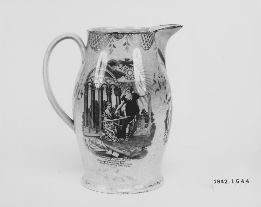 Creamware pitcher with polychrome printed decoration, baluster body, large spout, and "C" handle. Classical figures and masonic motifs.