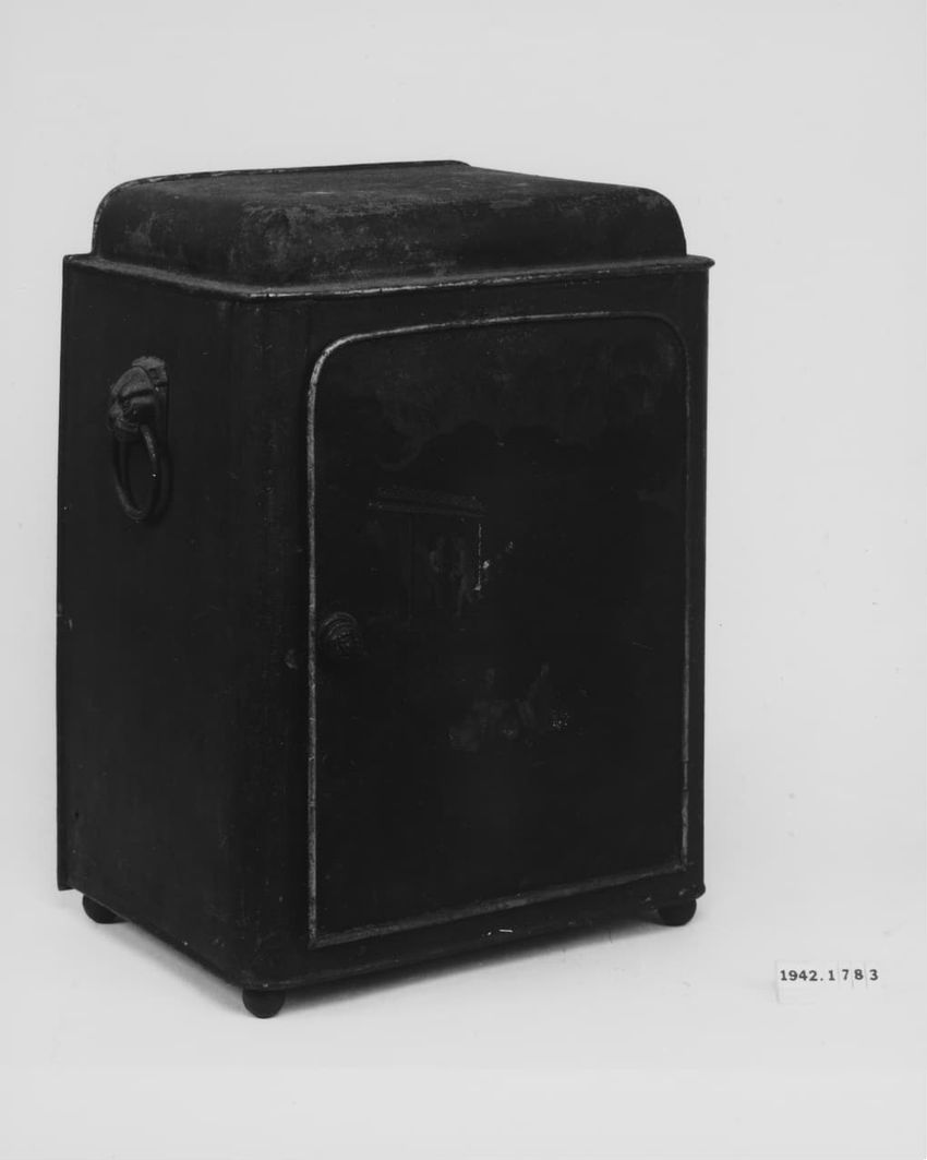 Red; rectangular with rounded top; hngd door; chinois. scns. porcelain prodct