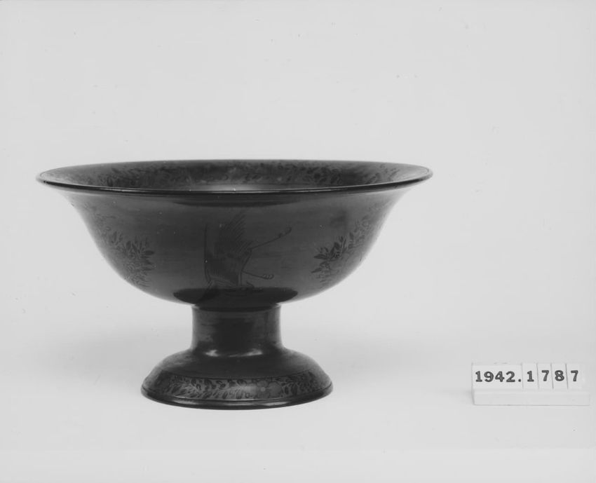 Red, black; circular foot, straight stem; body curved; flat lip; bird, floral