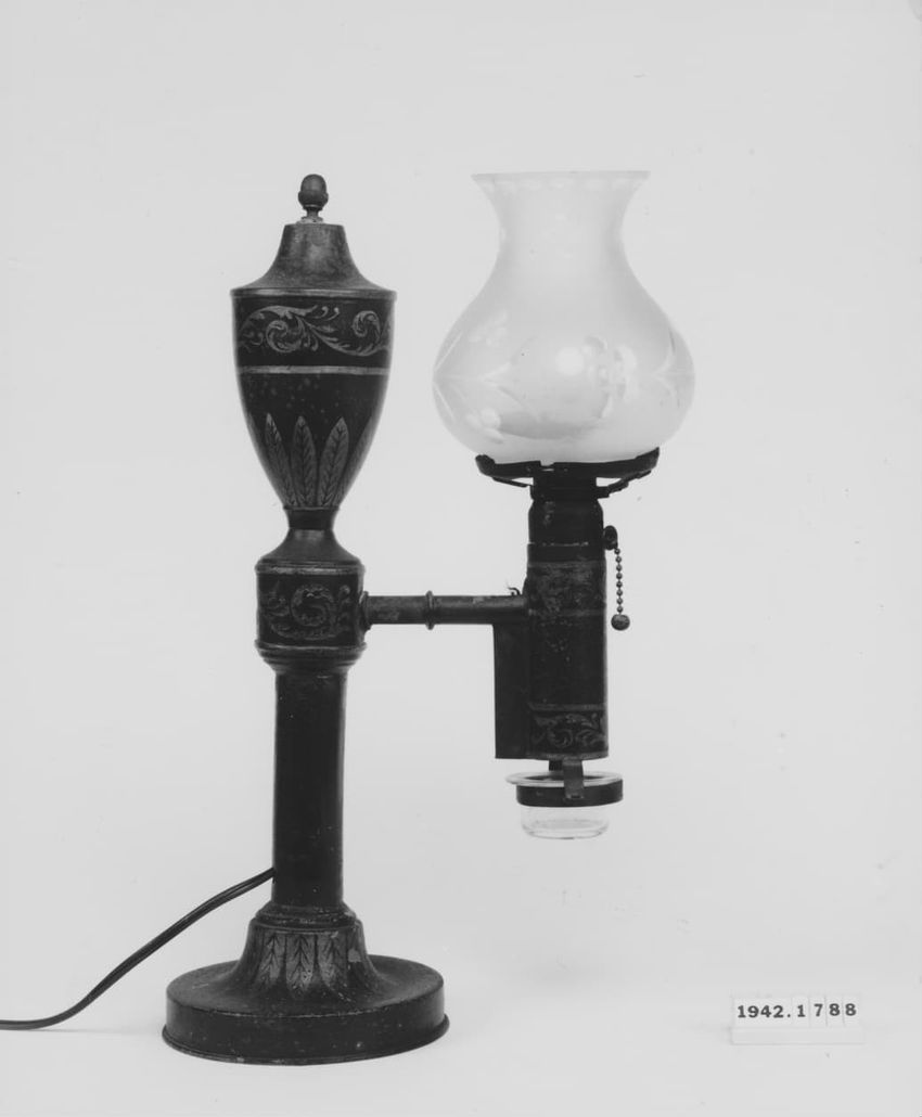 Red, black, and gold lamp with a circular foot; shaft; urn font; cylindrical burner arm; scroll and leaf details