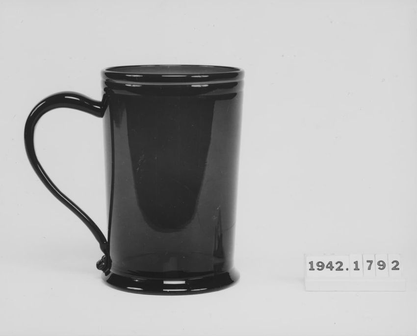Amethyst mug; cylindrical body; beaded lip; bevelled foot; thin ear shaped handles