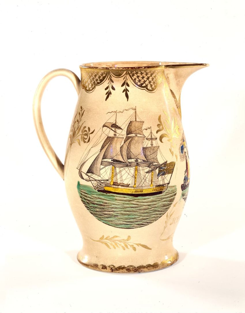 Cream, polychrome; baluster body, large spout, "c" handle; ships; Hope figure