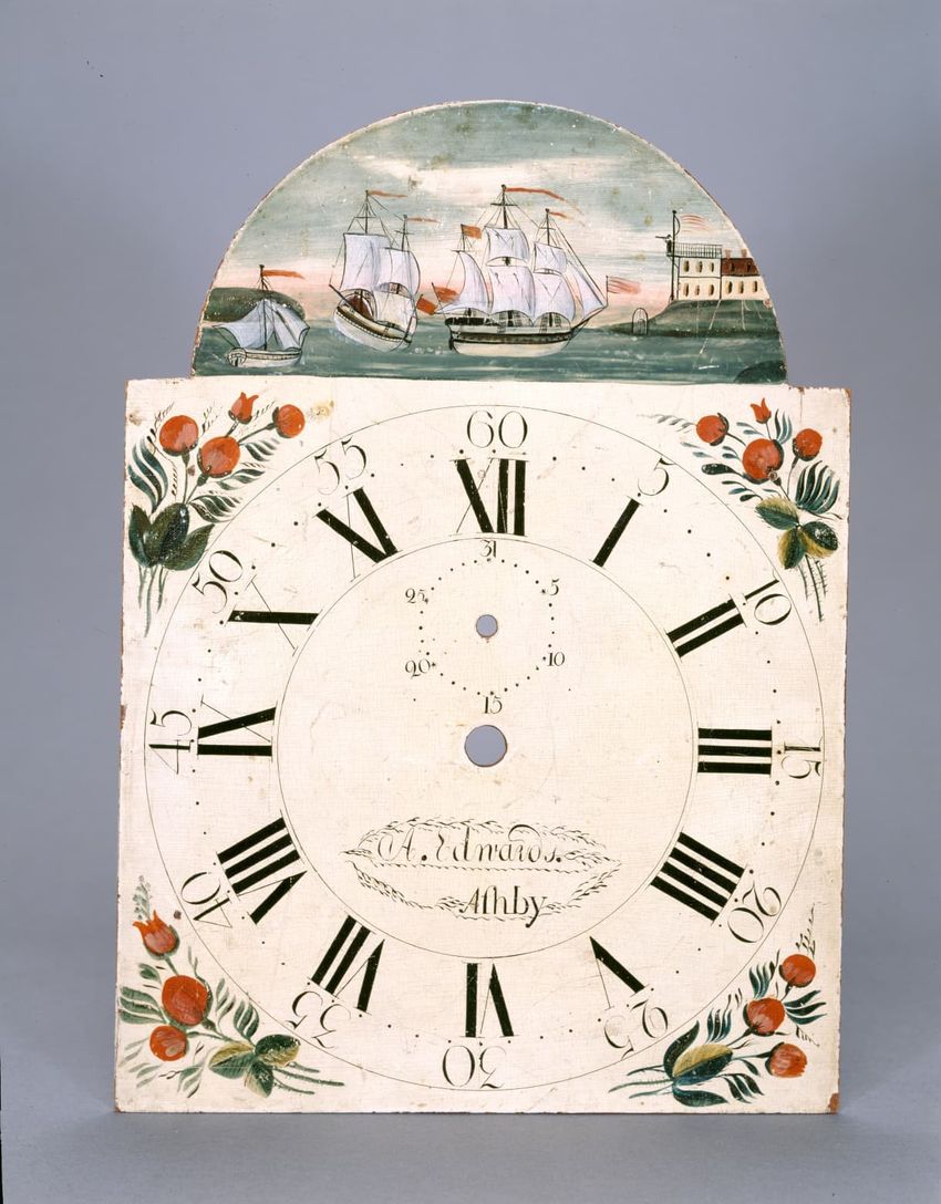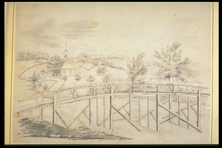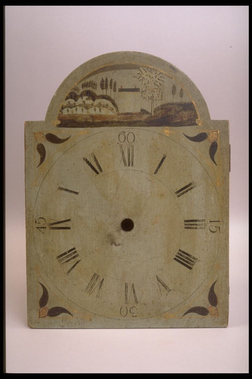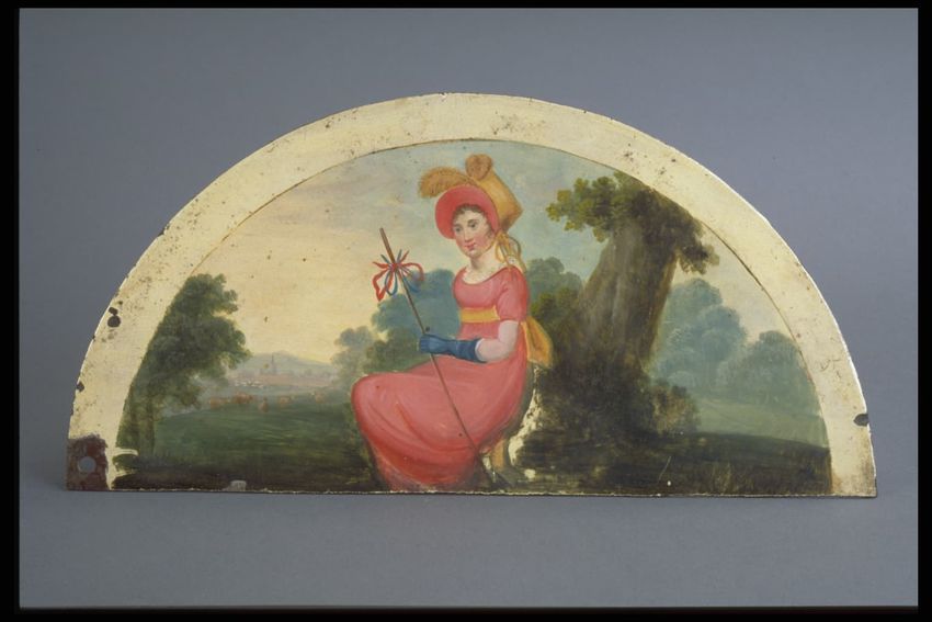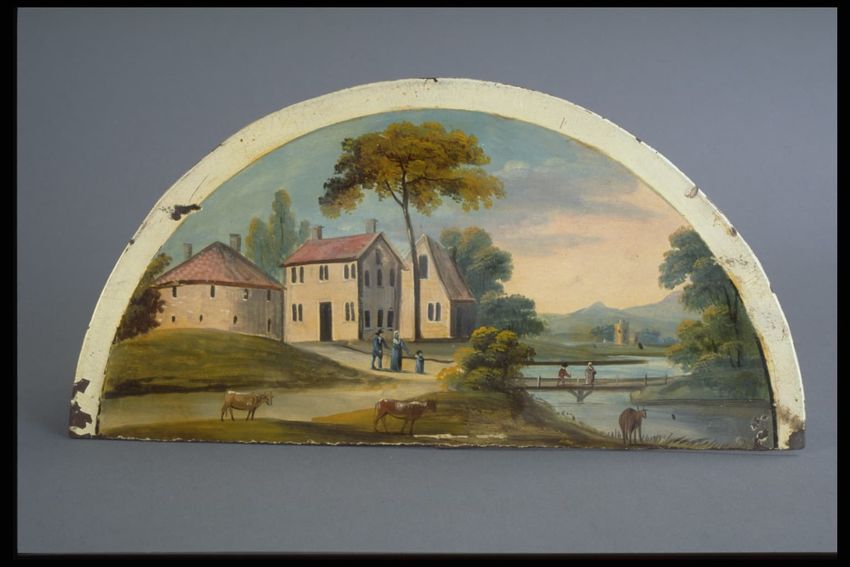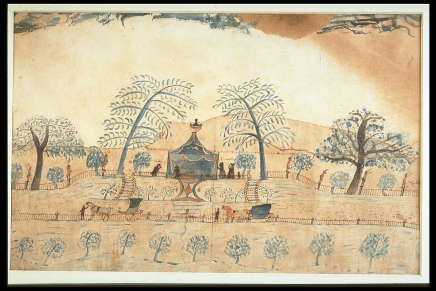 Of oblong rectangular format, depicting the mock funeral of Lord Timothy Dexter of Newburyport in 1799. A row of small trees run along the foreground and in the register above, a hearse and gig are led by their drivers. On the bank, in the background, a catalfalque is surrounded by five mourners. Tw...