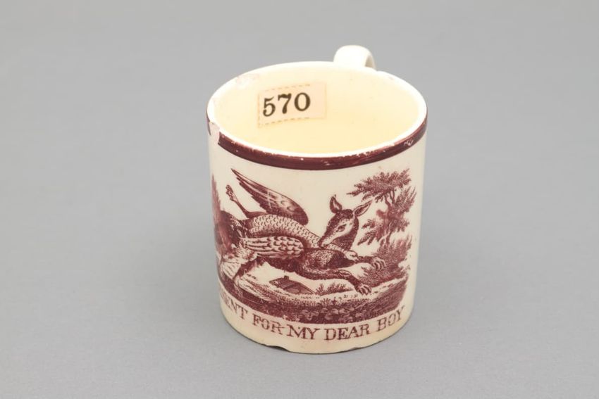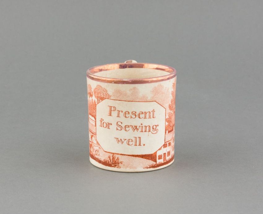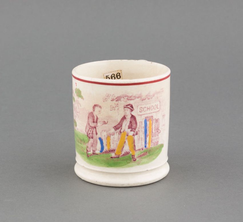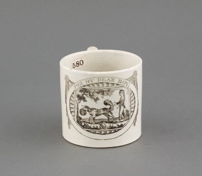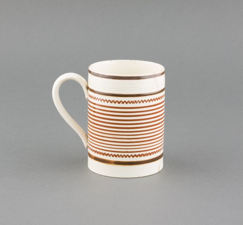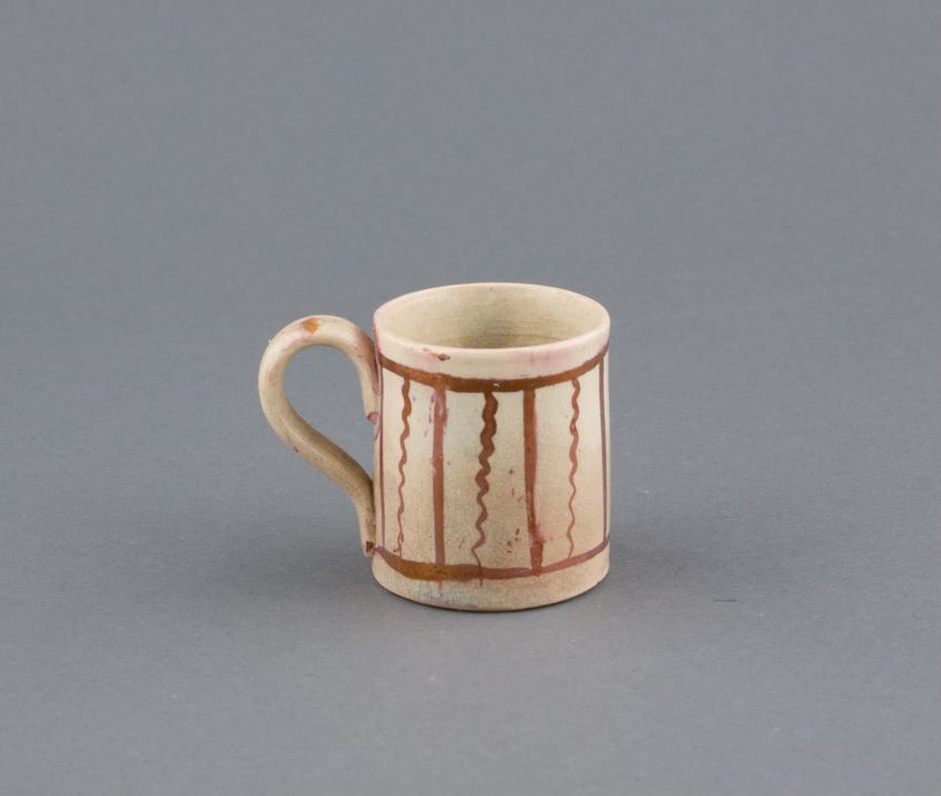Earthenware mug. Concave body, shaped base, and spurred loop handle. Glazed olive green around body. Two applied decorations: on one side, a rose on a stem; on the other side, a shephard tending sheep. Over painted with red, green, and brown.