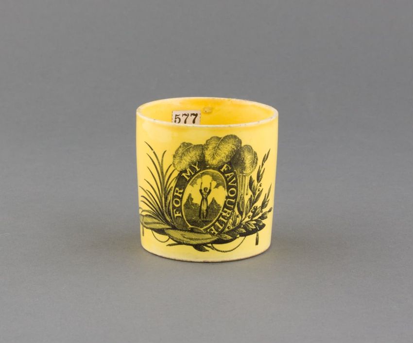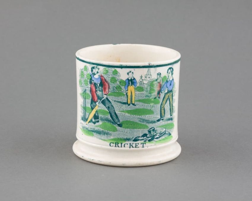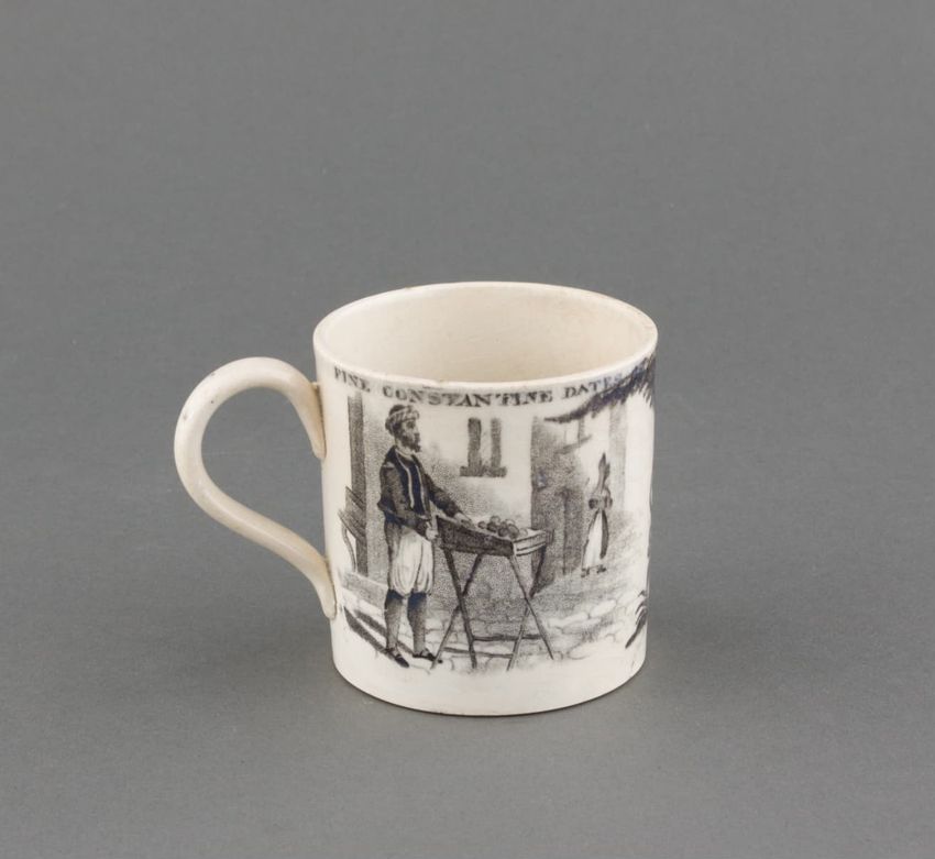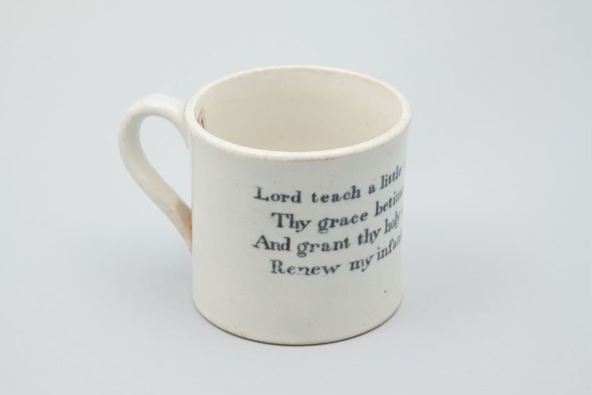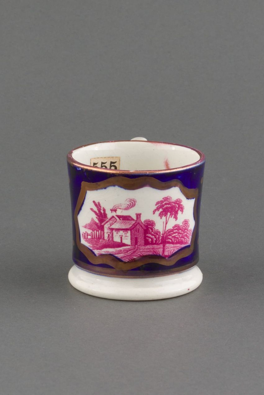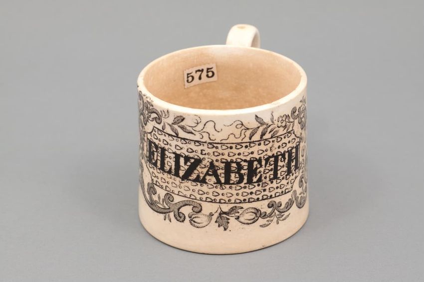 Earthenware mug. Concave body, shaped base, and spurred loop handle. Glazed olive green around body. Two applied decorations: on one side, a rose on a stem; on the other side, a shephard tending sheep. Over painted with red, green, and brown.