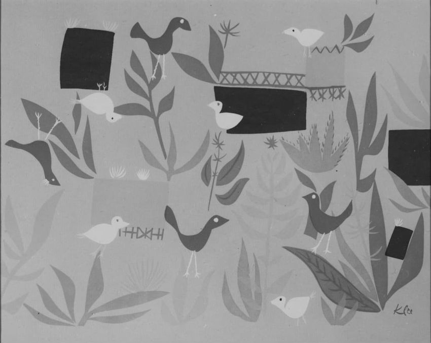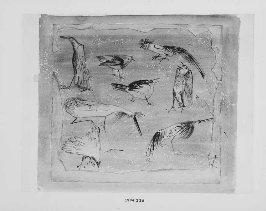 Beige ground with fanciful birds and foliage; browns, greens, blue, red-orange, white