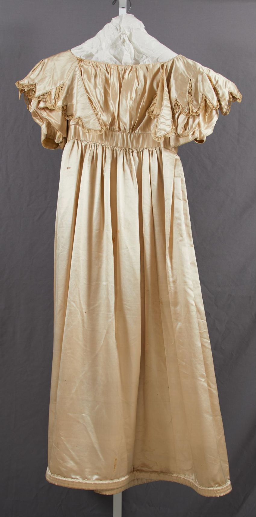 Ivory satin wedding dress with short, puffed sleeves with piped cuff. Van Dyke collar extending off shoulders with scalloped and piped edge, trimmed with lace. Shirred front and back; hook and eye closure. Wide waistband. Bodice lined with linen. Sleeves lined with glazed cotton. Hem is stiffen...