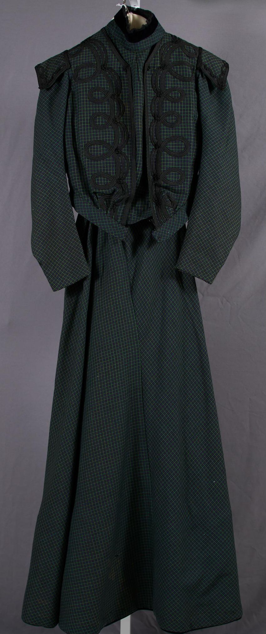 Two piece dress made from blue and green wool check; A=Bodice shows a standing band collar with black velvet & black ruffle; hook & eye at closure at collar back. Blouson front with placket covering "vest" with hook & eye closure; jabot of black lace. Epaulets and front trimmed with black braid; l...
