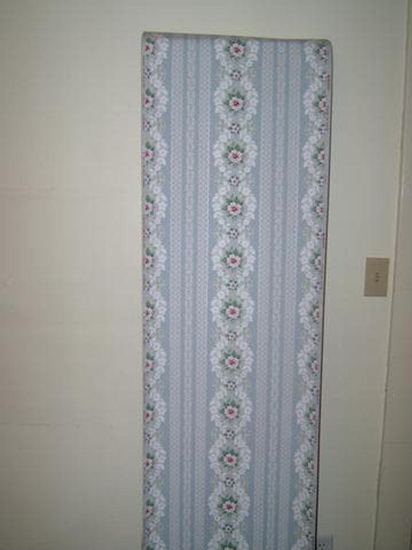 Roll of wallpaper with two vertical columns of urns of flowers, chains and sprays of foliage, and a rosette in a cartouche in white, gray and red on a tan ground, columns separated by two bands of vertical crimson lines and a chain of abstract flowers.