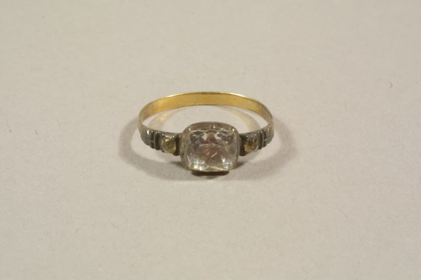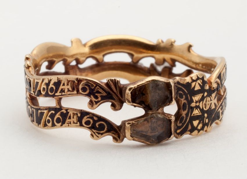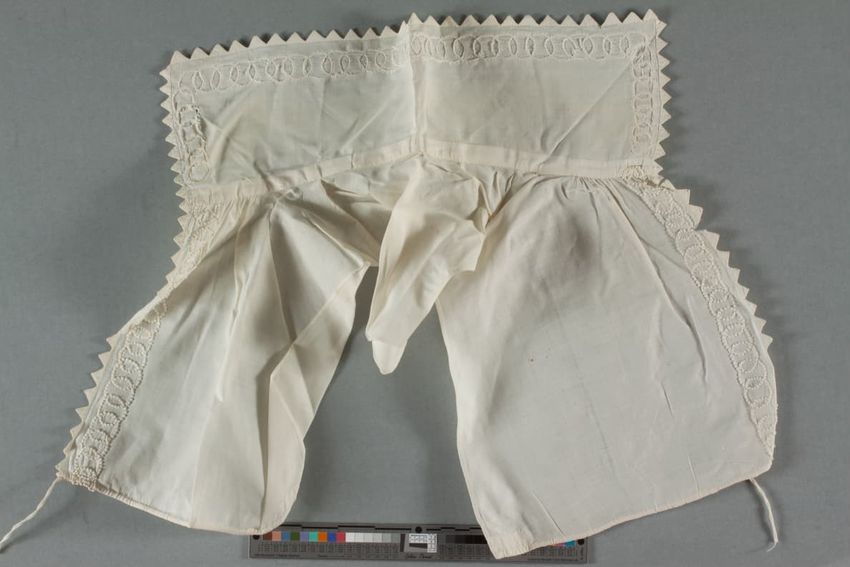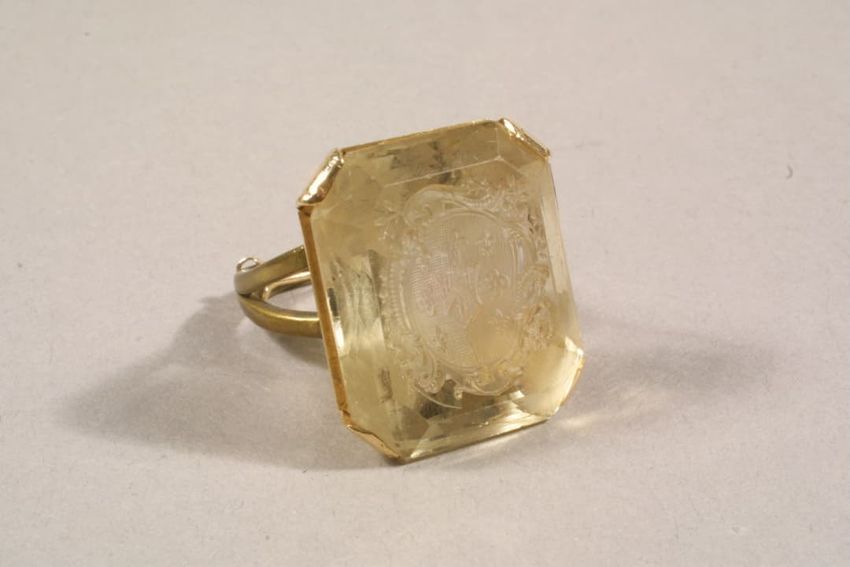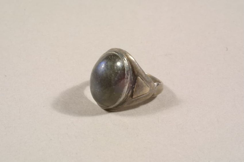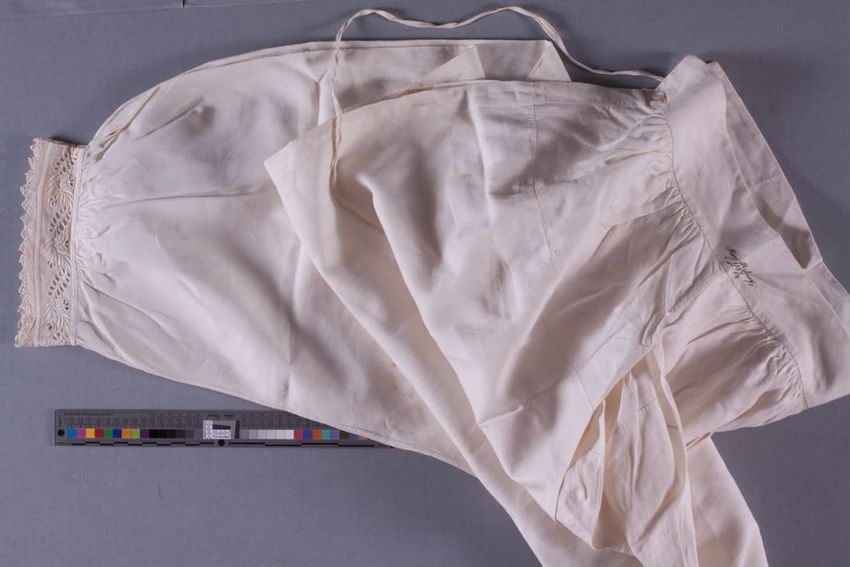 Silver oval locket, front has an applied gold cipher of an entwined endless knot and the letter C, inside compartment contains a lock of blonde hair under glass and a newspaper clipping, loop attachment at top.