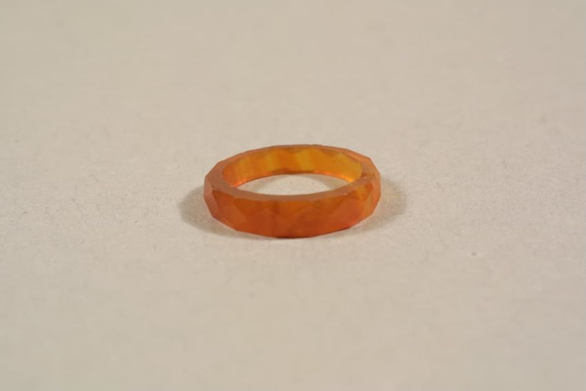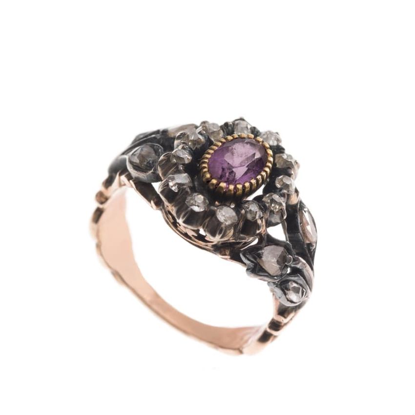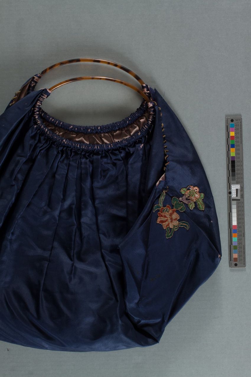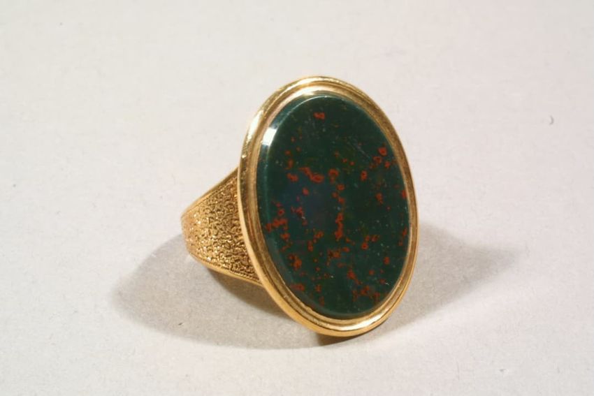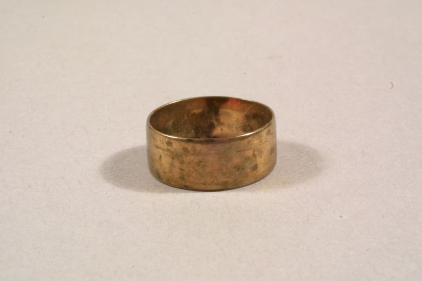 Silver oval locket, front has an applied gold cipher of an entwined endless knot and the letter C, inside compartment contains a lock of blonde hair under glass and a newspaper clipping, loop attachment at top.
