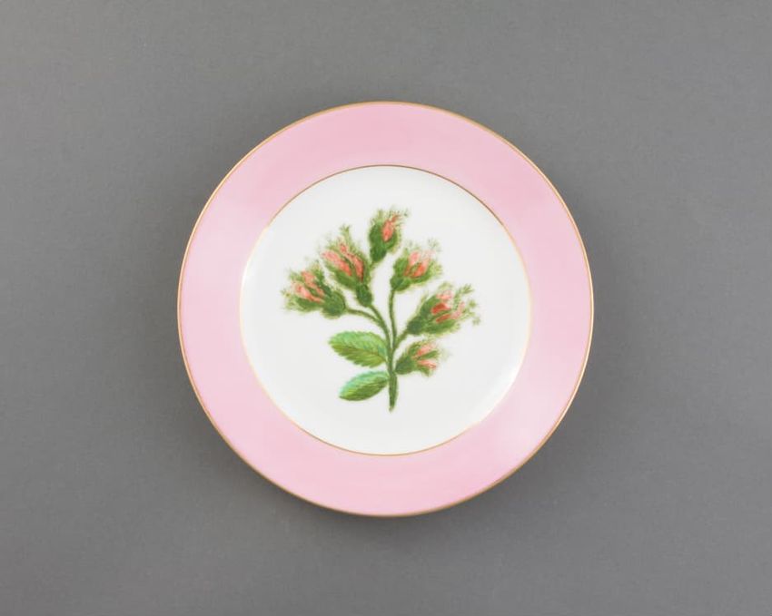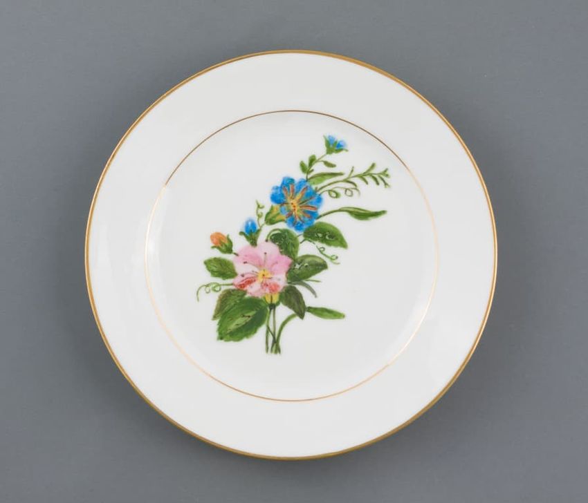 Porcelain plate with gold banded border surrounding hand-painted flowers and leaves in blue, red, orange, pink, and green.