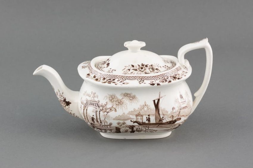 Child-sized whiteware teapot squat-shaped with rectangular knop, scrolled spout and tall, pointy, scrolled handle with brown transfer-printed scene of two figures on a boat approaching a pavilion with trees, flowers, and building in the distance, scrollwork and flower spray border around the lid and...