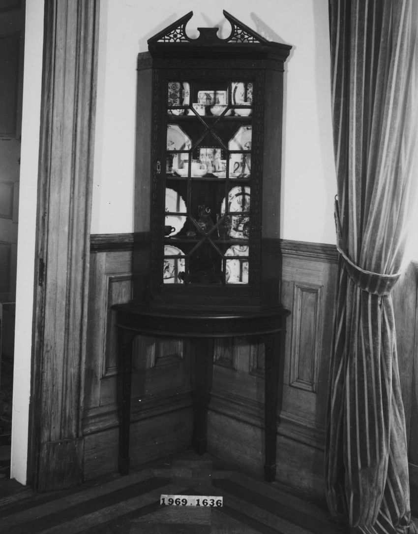Fretwork carving; pierced pediment; glazed door; 4 shelves