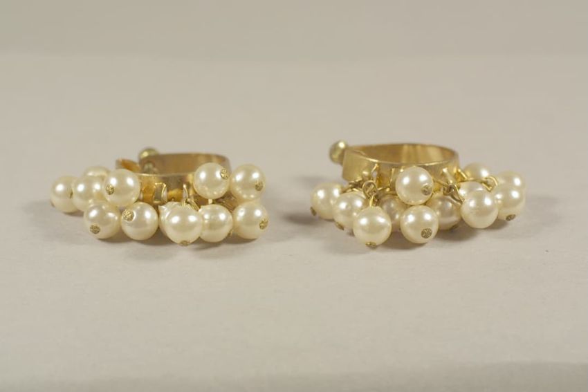 Each earring in this pair consists of a gold-colored metal hoop embellished with with faux pearls set on gold-colored metal pins to form a cluster. The earrings attach with screw back fasteners.