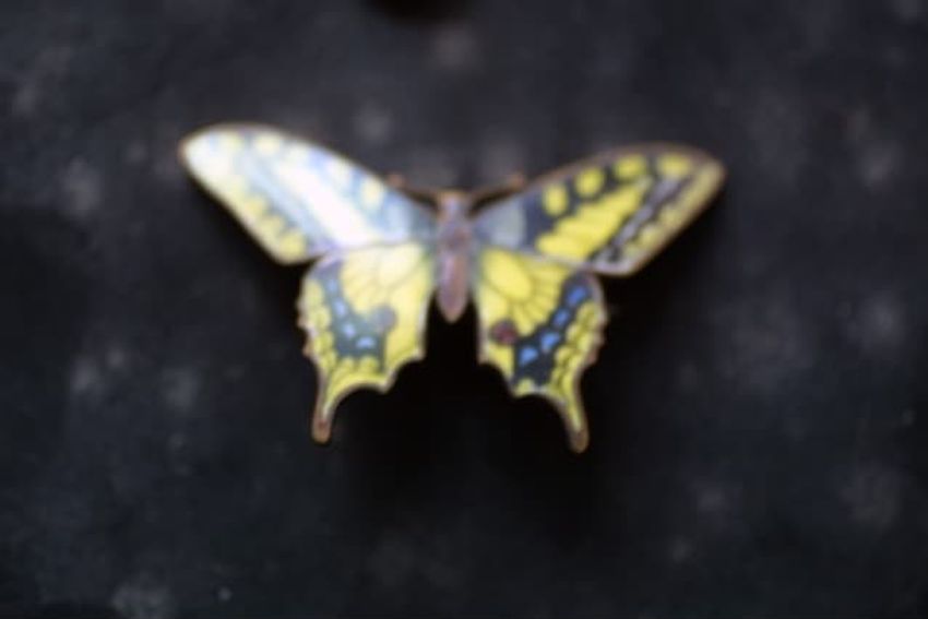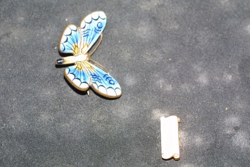 Butterfly brooch with blue and white enamel wings and red eyes.