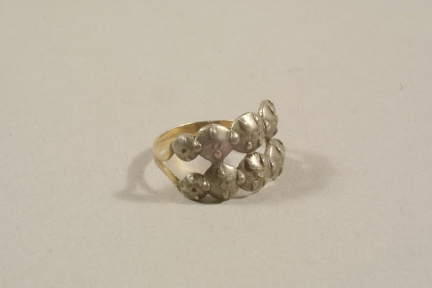Gold ring with open-work shoulders and two rows of silver circles each set with faux prongs and small diamonds (three missing).