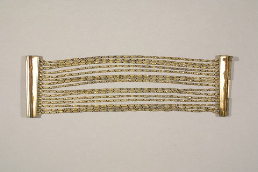 This gilt metal Victoria bracelet is composed of fifteen strands of chain, with each chain attached at each end to a long bar clasp.