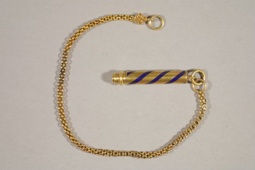 This watch fob of fourteen-karat gold is decorated with a single spiral of guilloche engraving under blue enamel.