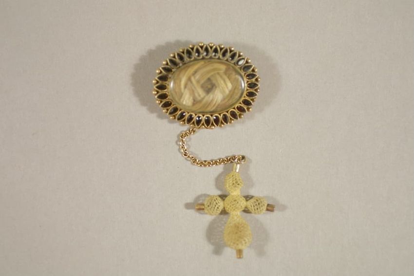 This oval-shaped brooch is set with a braided knot of human hair under glass. The center is surrounded by a border of drop-shaped faceted jet set in gold mounts. Suspended from the center base of the oval on a thin gold link chainis a pendant tableworked hair cross with gold mounts.