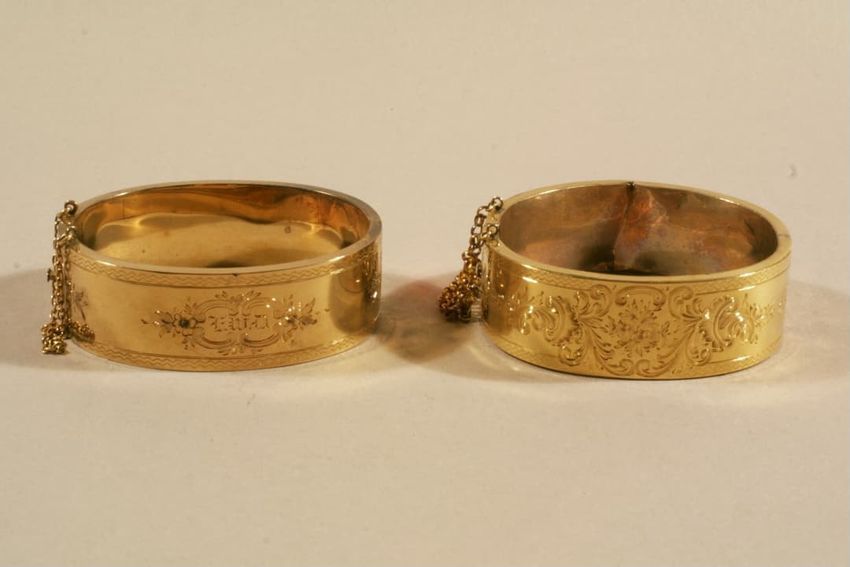 Pair of gold hinged bangle bracelets with scroll and foliate engraving and monogram in front, safety chain attached at hidden push button clasp. Original leather fitted box with purple velvet and silk lining.