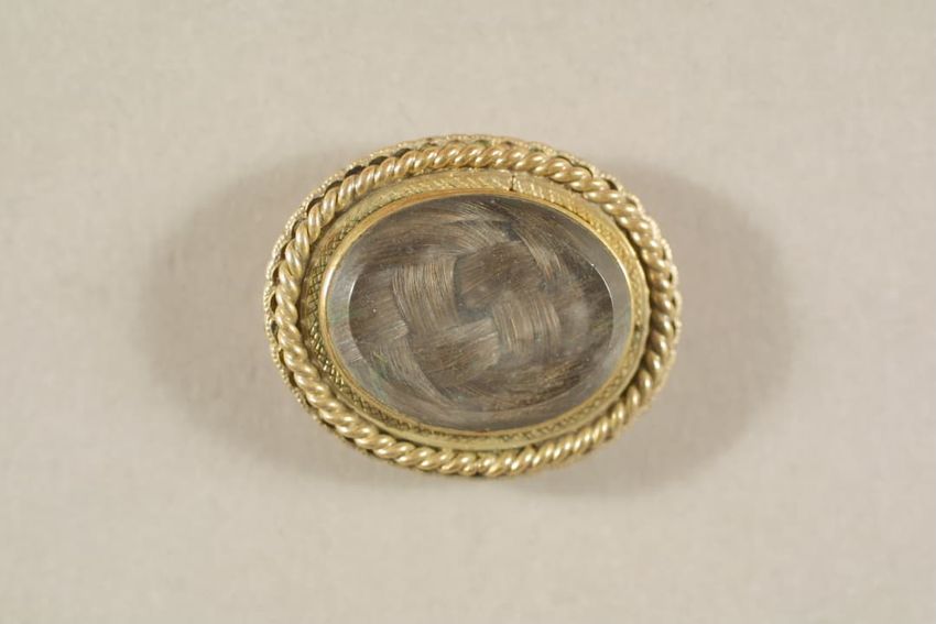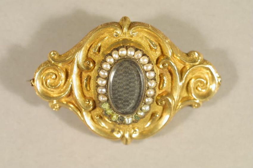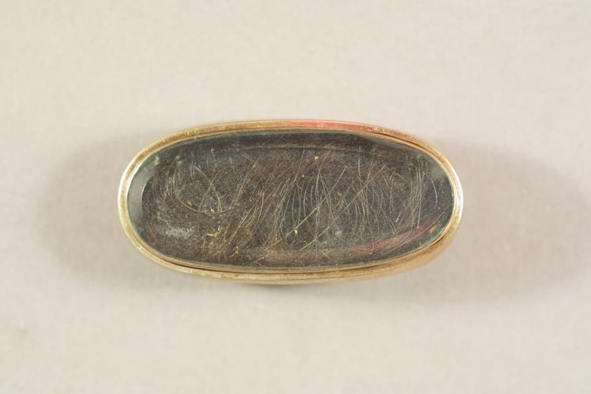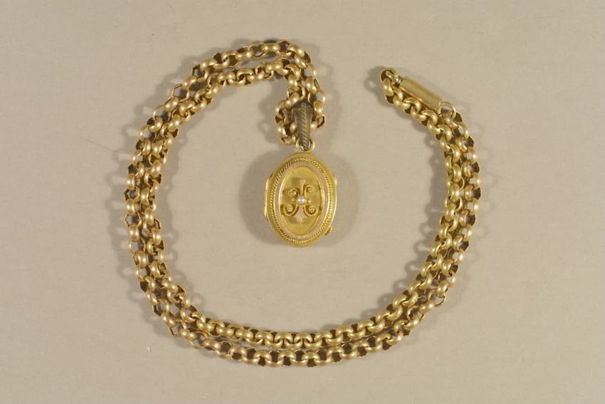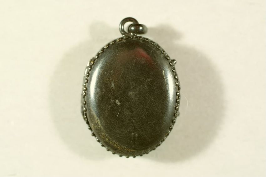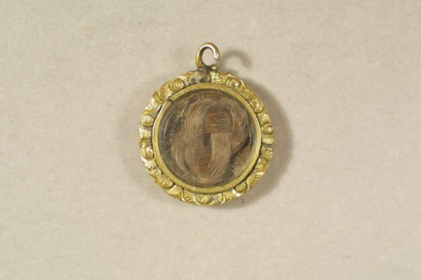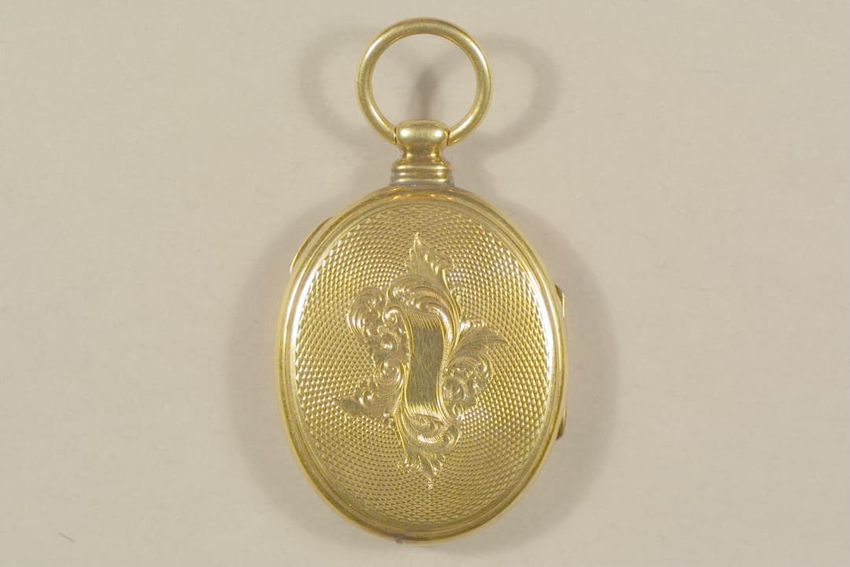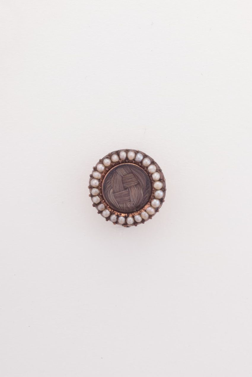 Gold circular pendant, center set with palette worked curls, pearls and pieces of gold wire over a milk glass background, reverse has small compartment set with gold initials "JG" over brown hair in basket weave pattern, gold loop on top for attachment. White paper box with red edges and pink-tinted...
