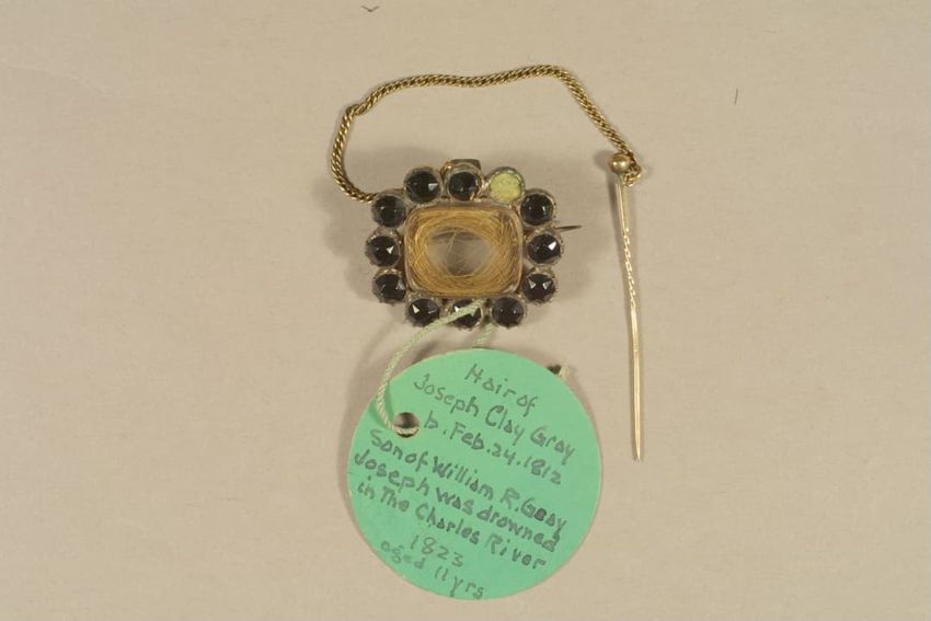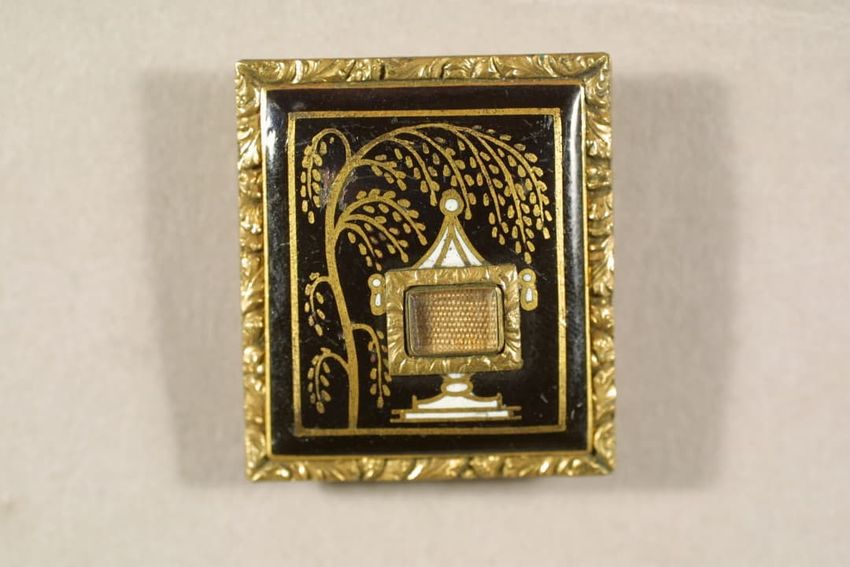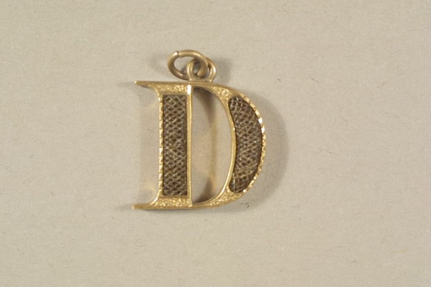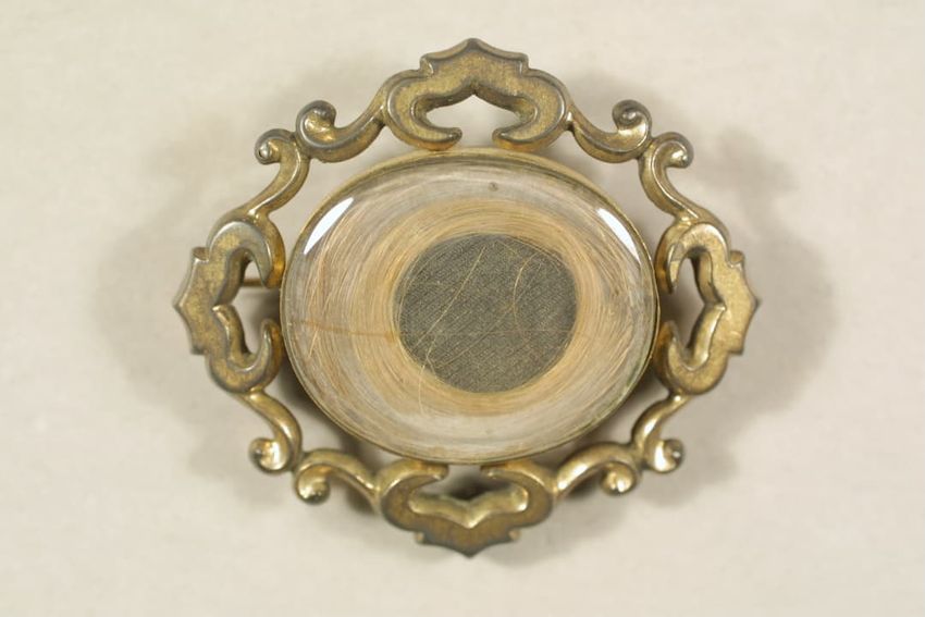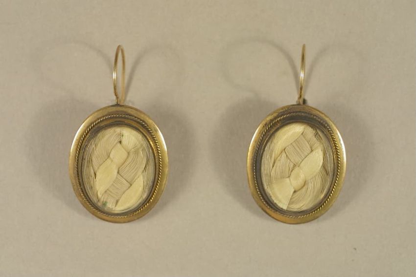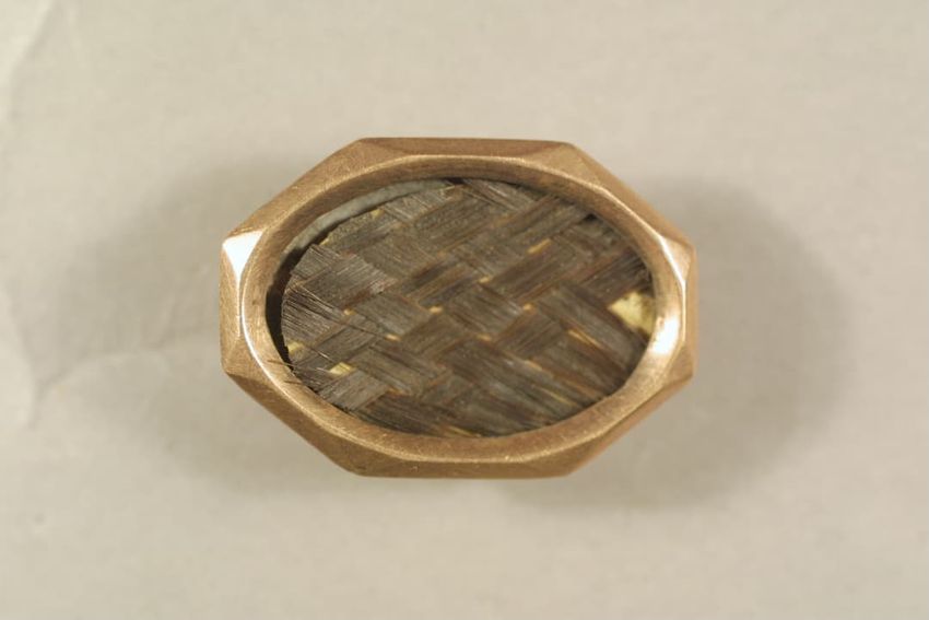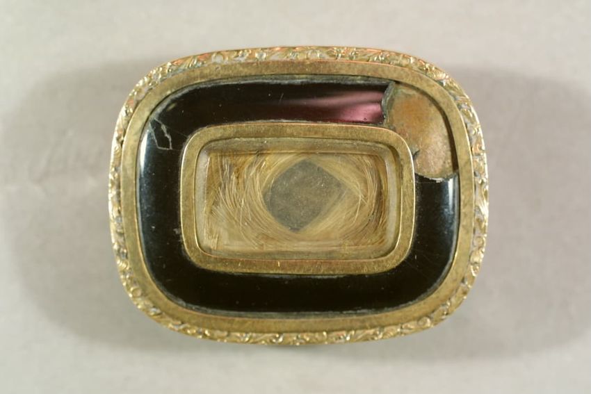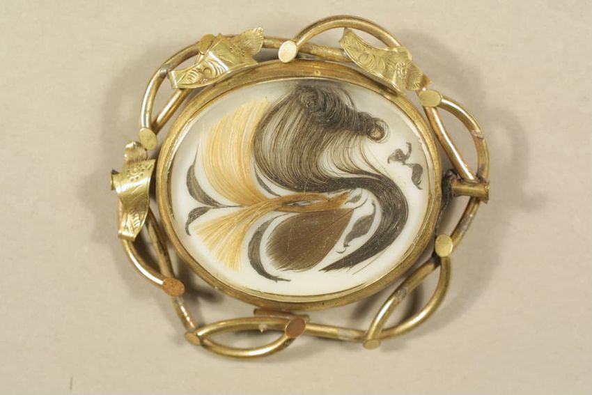 Gold circular pendant, center set with palette worked curls, pearls and pieces of gold wire over a milk glass background, reverse has small compartment set with gold initials "JG" over brown hair in basket weave pattern, gold loop on top for attachment. White paper box with red edges and pink-tinted...