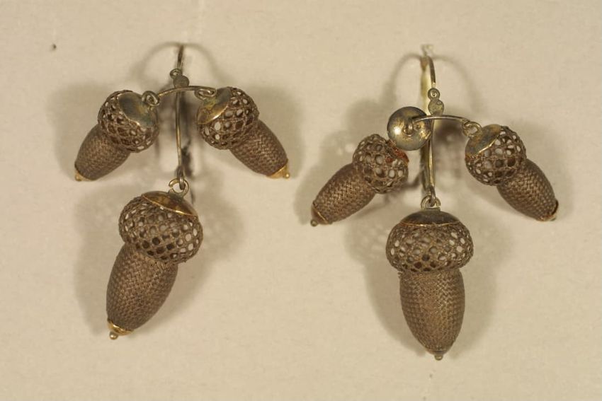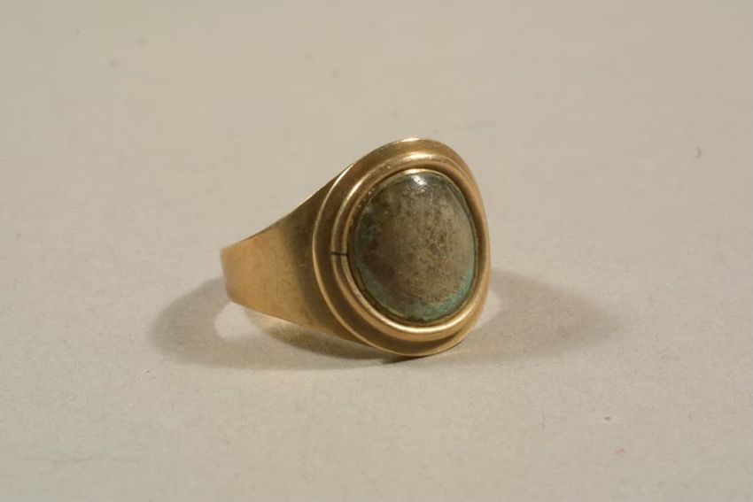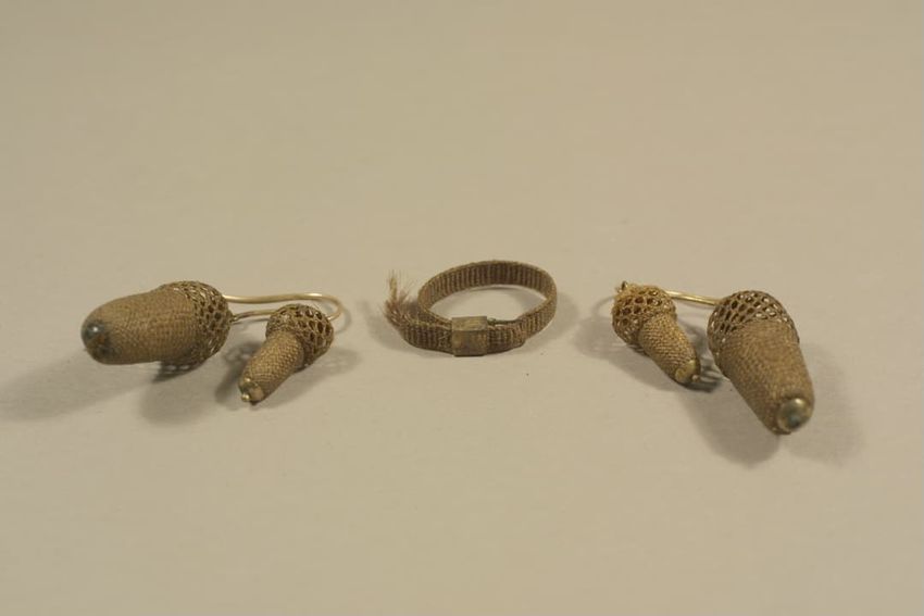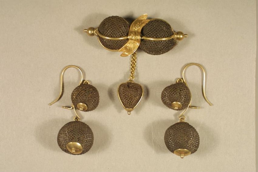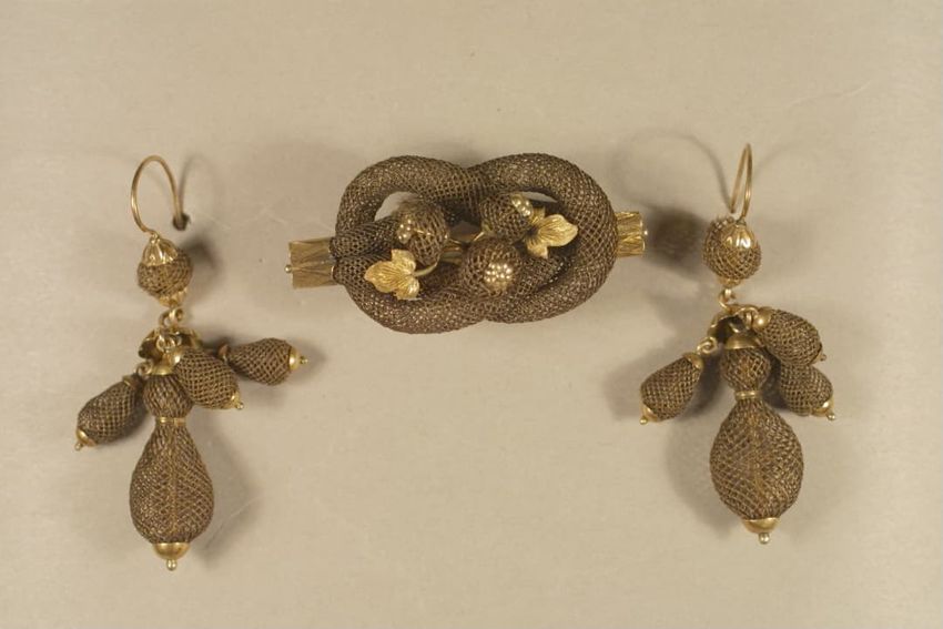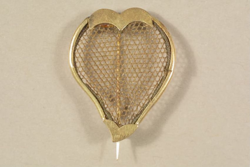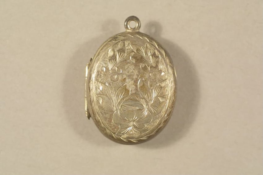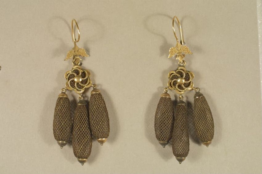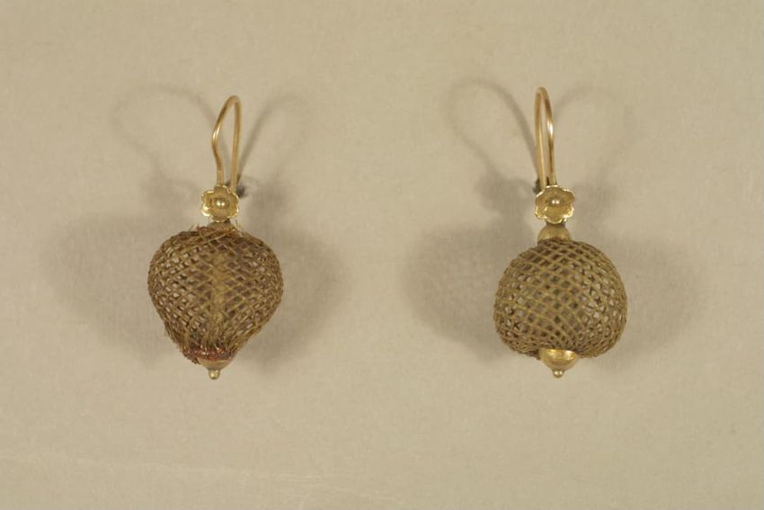 Gold circular pendant, center set with palette worked curls, pearls and pieces of gold wire over a milk glass background, reverse has small compartment set with gold initials "JG" over brown hair in basket weave pattern, gold loop on top for attachment. White paper box with red edges and pink-tinted...
