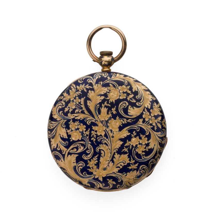 A gold pocket watch with intricate engraved design of blue stars on outer case. Watch face has black Roman numerals under glass