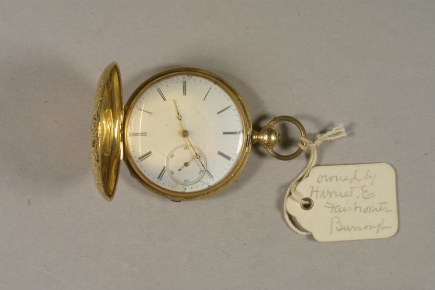 Watch with silver case and two leather straps, one attached and one unattached. The outer case has 9 labels of Phineas Rice, watchmaker, each with a date showing when the watch was cleaned. Outer watch face is a small circle under glass and is opened to a larger white watch face with two sets of Rom...
