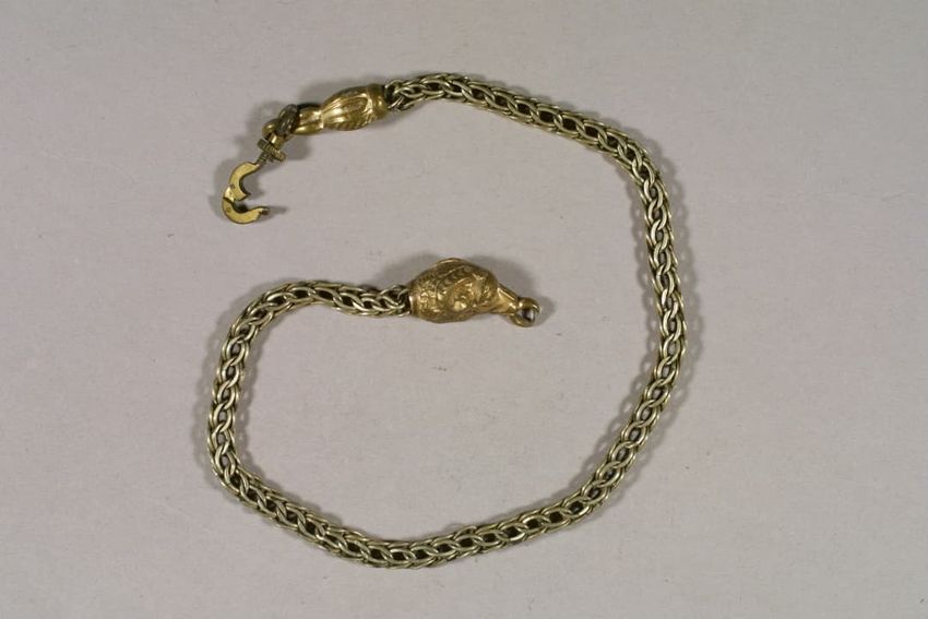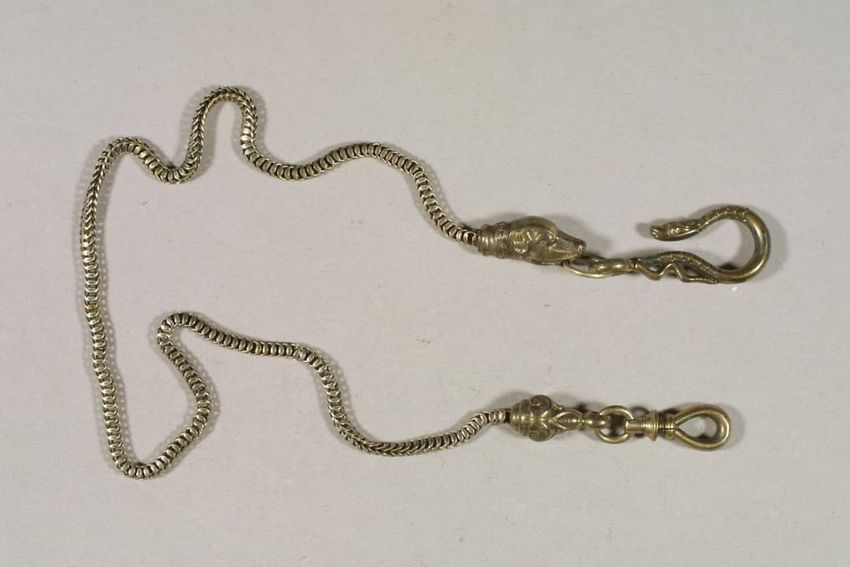 Gold washed link watch chain, one end has a dog's head holding a serpent shaped hook in its mouth, the other end has loop attachment.
