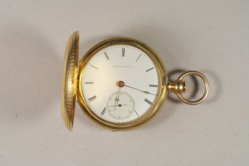 Gold pocket watch that opens on both sides. Watch has Roman numerals and watch face is under glass. Both sides of outer watch case have light patterns and a flay circle in the center. Inside of watch case across from watch face has two circles of rope-like engraving.